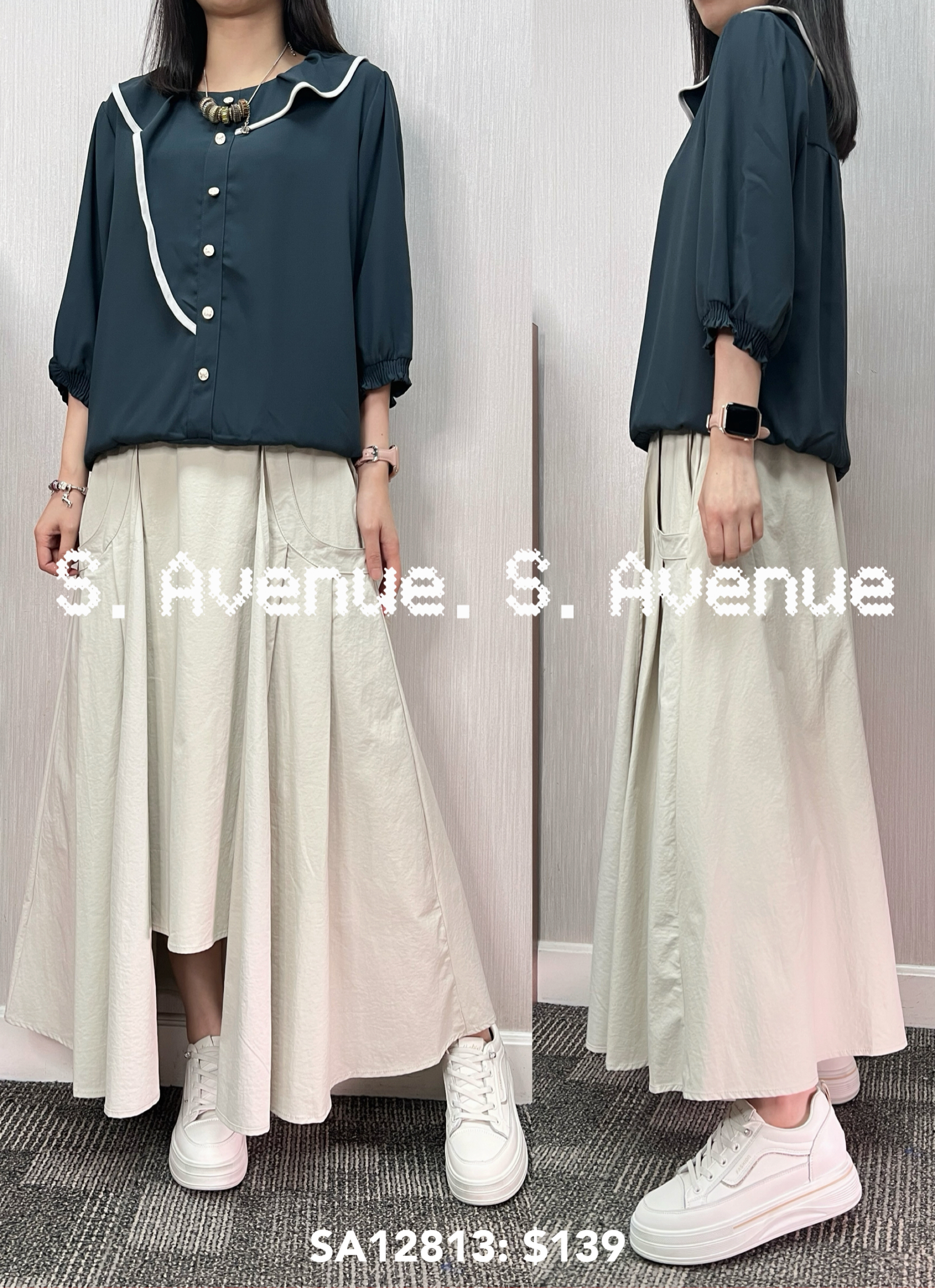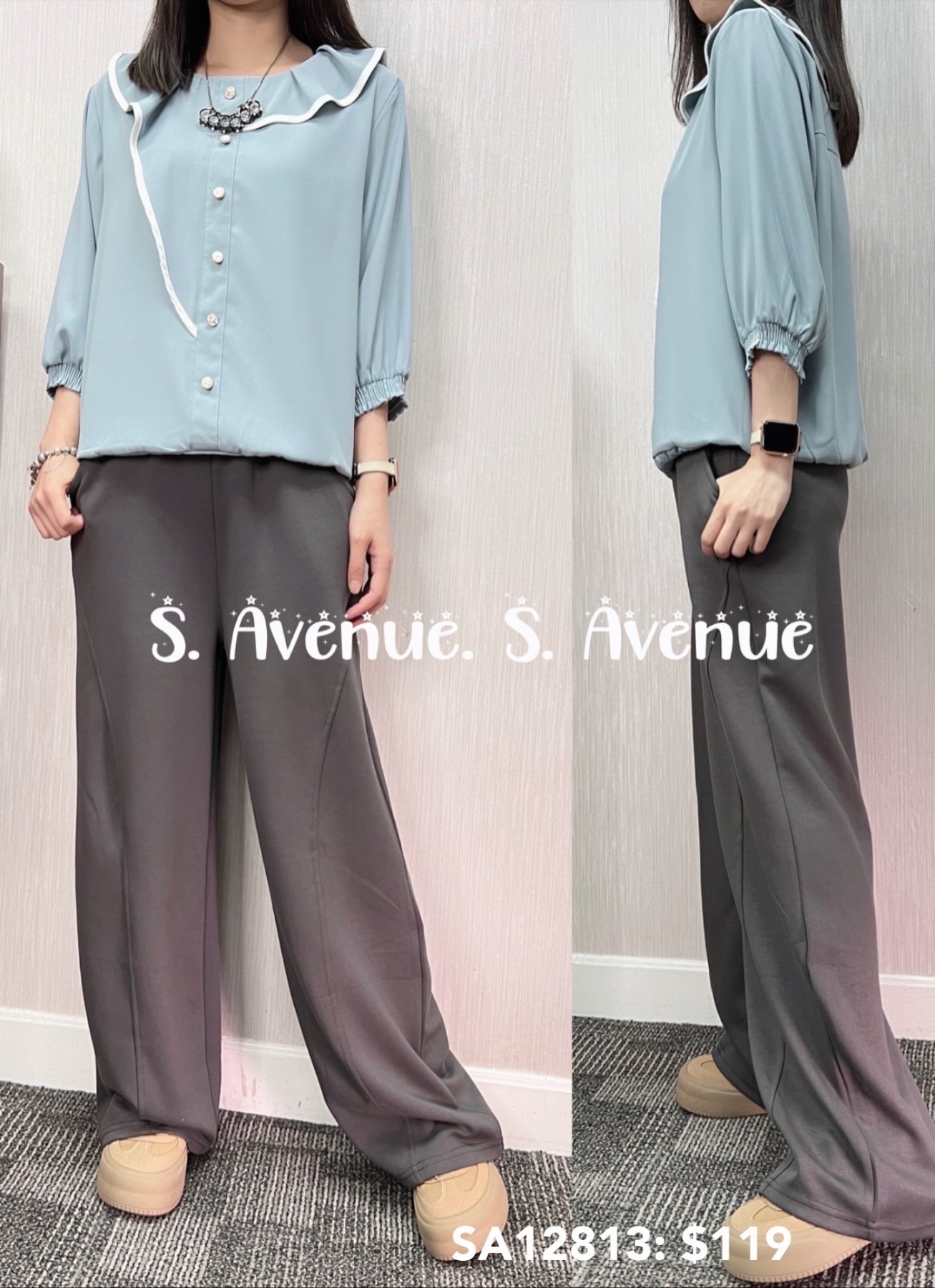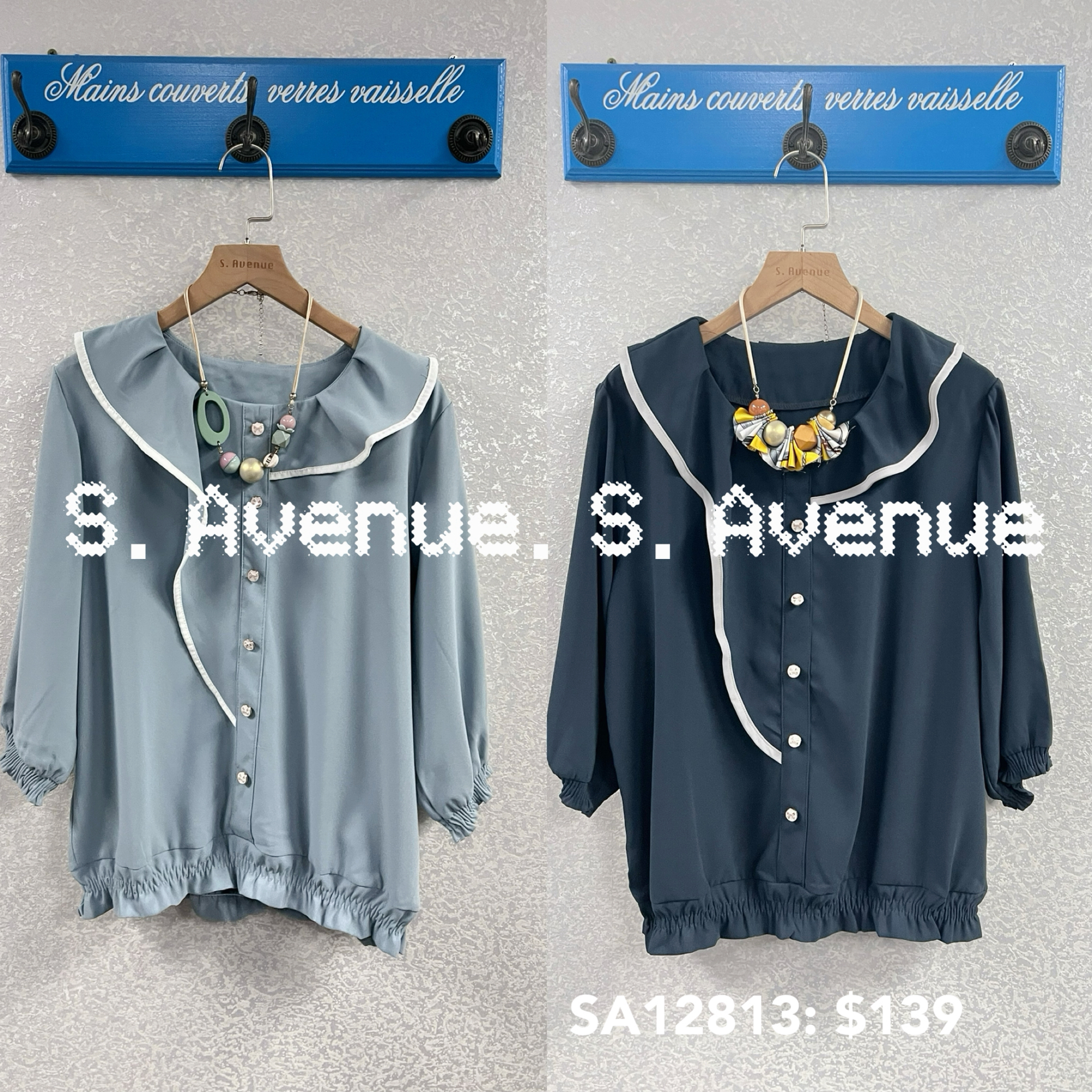 SA12813: 中袖前有假鈕下橡根白邊ruffle top、質地是雪紡,靚料靚款推介 顏色: 綠藍,淺藍 Price: $119 One size: 適合m至L碼的身型,布料沒有彈性 尺寸:上圍42吋,腰42吋,長23吋 (尺寸只供參考,每人度均有不同,請預一至兩吋走盞)