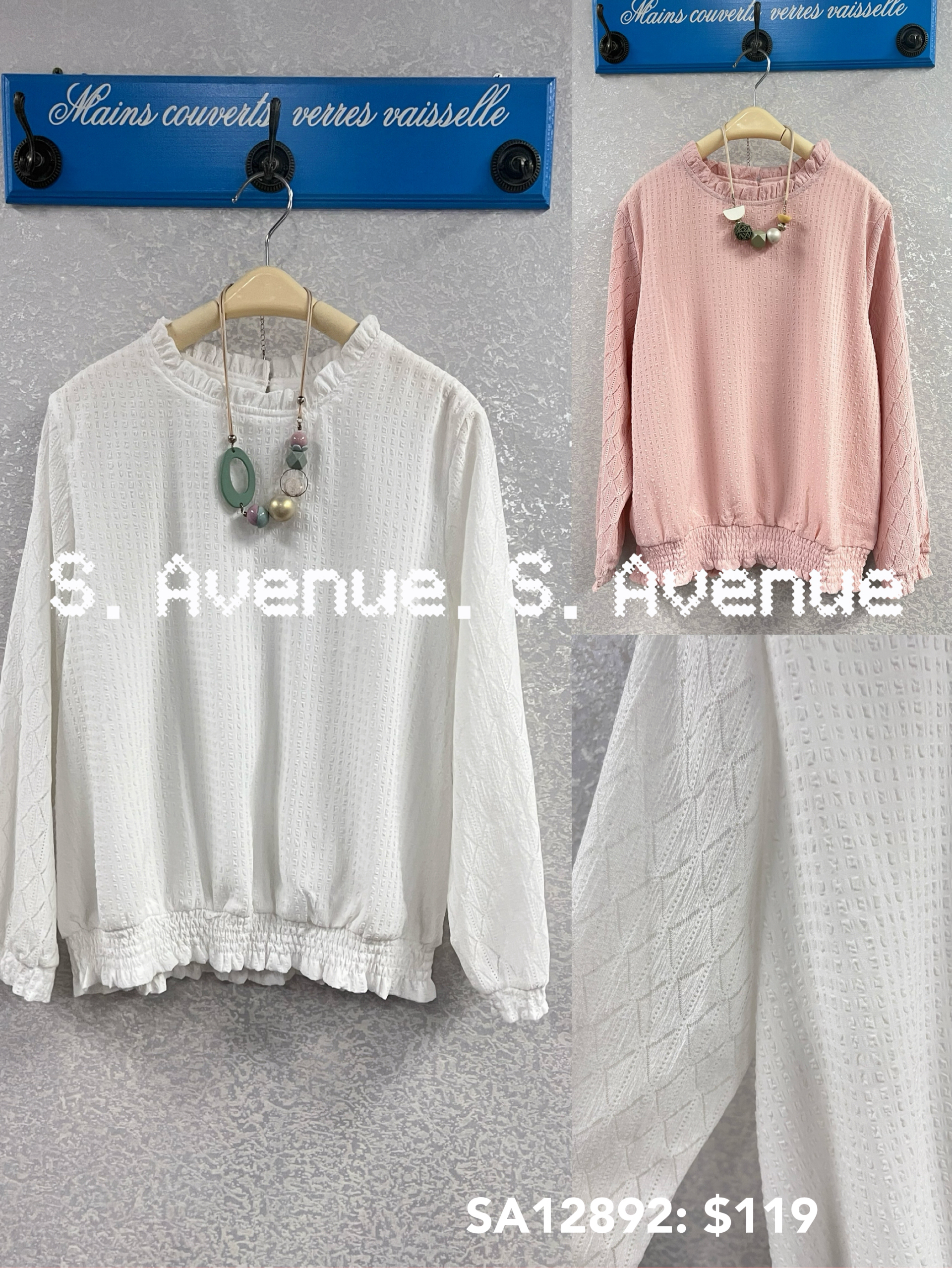 SA12892: 長袖花邊領下橡根top,質地是突紋雪紡,有里布不透靚款 顏色: 粉,白 Price: $119 One size: 適合m至L碼的身型,布料沒有彈性 尺寸:上圍42吋,腰42吋,長23吋 (尺寸只供參考,每人度均有不同,請預一至兩吋走盞)