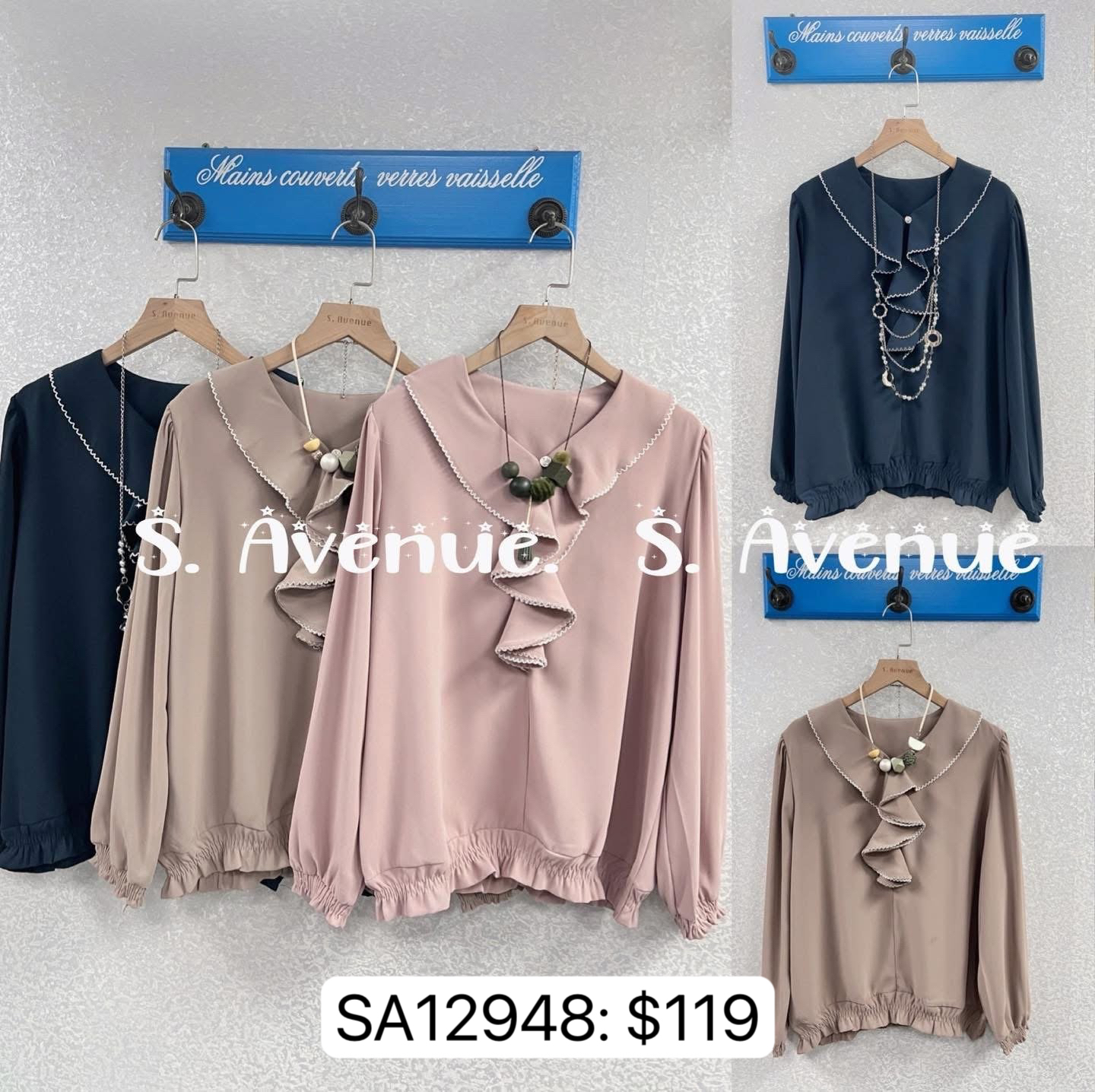 SA12948: 長袖V領ruffle下橡筋top,質地是雪紡,靚款推介 顏色: 粉紅,卡,深綠 Price: $ 119 One size: 適合m至L碼的身型,布料沒有彈性 尺寸:上圍42吋,腰42吋,長24吋 (尺寸只供參考,每人度均有不同,請預一至兩吋走盞)