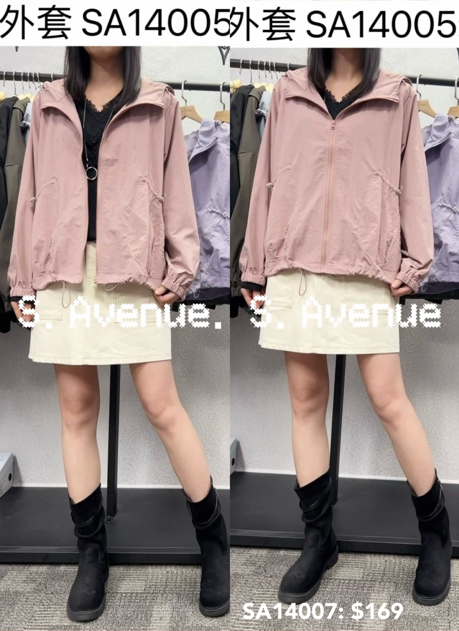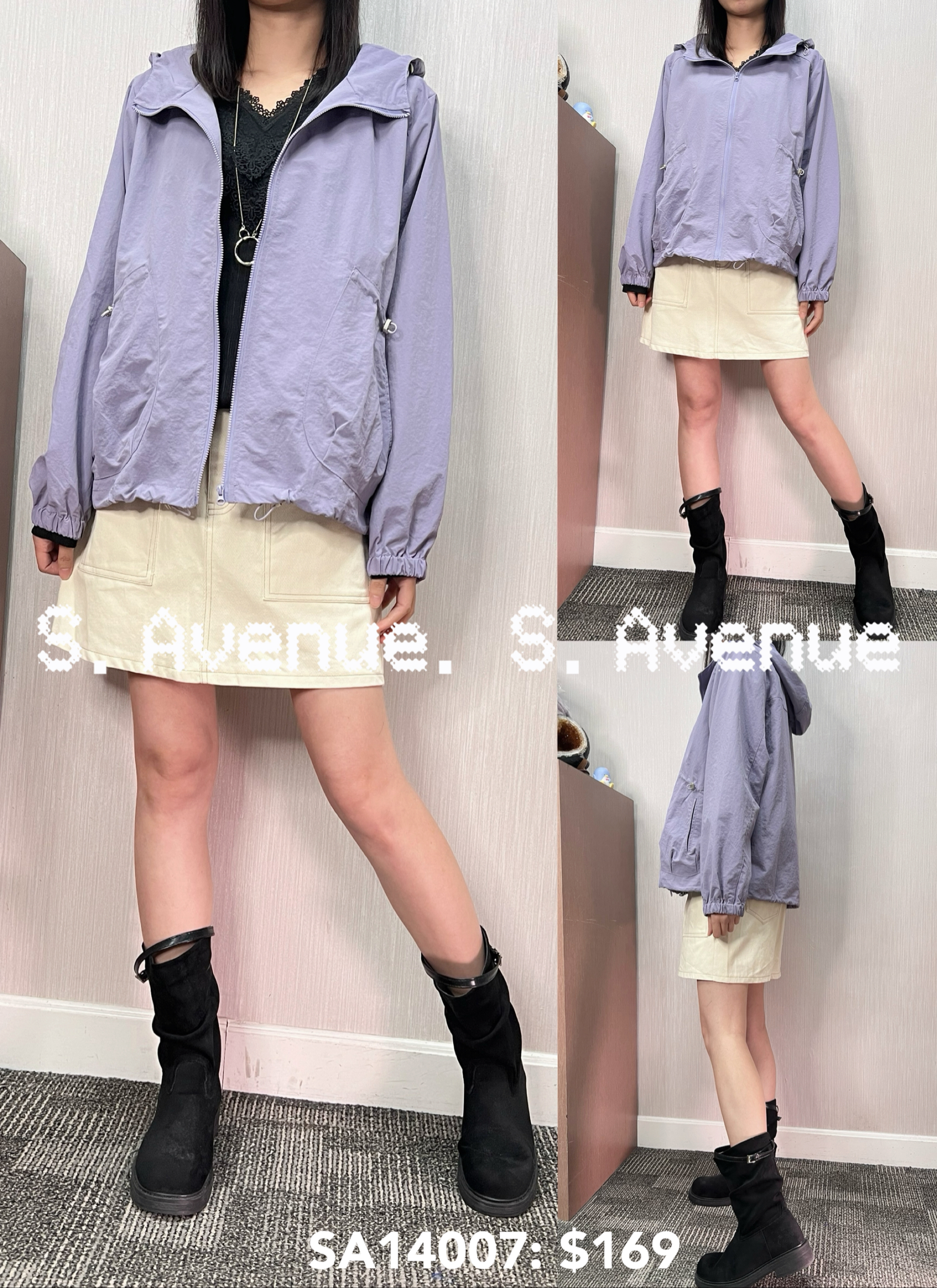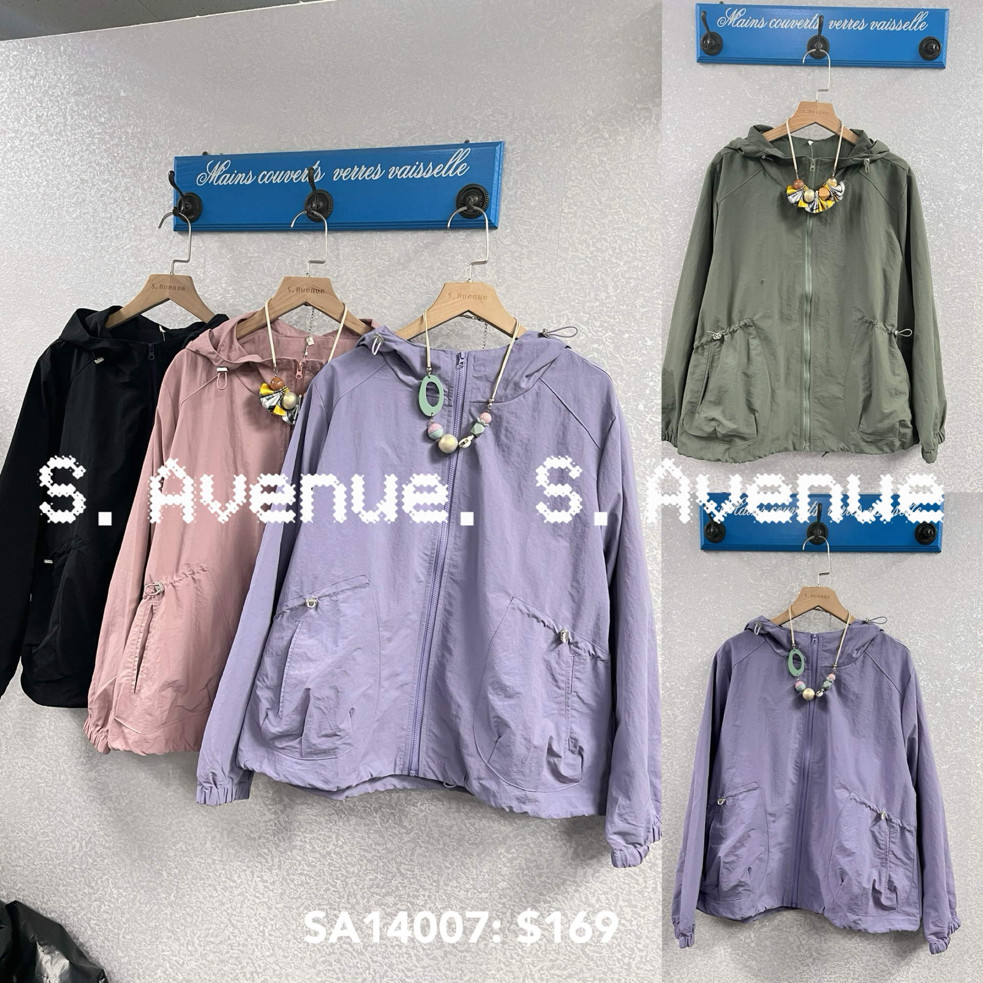 SA14005: 長袖有帽鈄袋束繩拉錬外套,質地是快乾風褸料,有真袋,靚款靚色,😍大推 顏色: 黑,粉,紫,綠 Price: $ 169 One size: 適合m至L碼的身型,布料沒有彈性 尺寸:上圍44吋,腰44吋,長24吋 (尺寸只供參考,每人度均有不同,請預一至兩吋走盞)