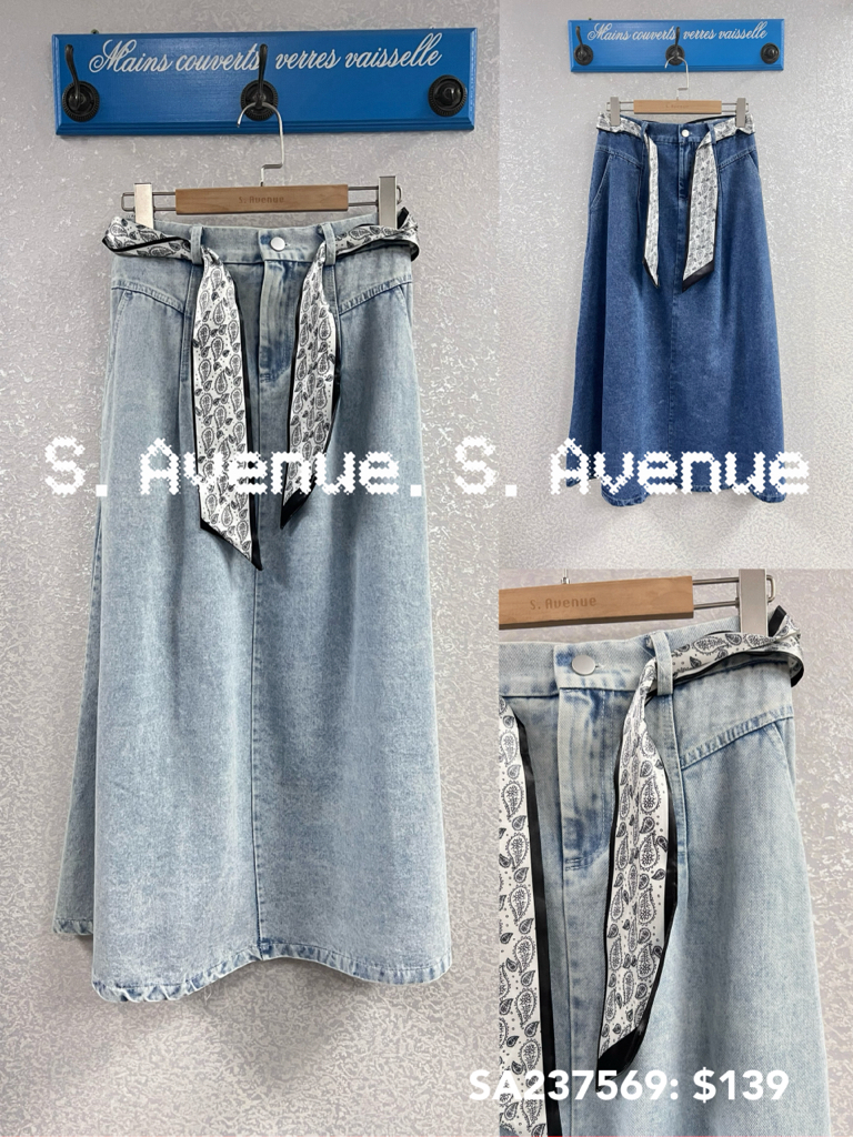 SA237569: 前拉錬後橡筋腰有腰帶牛仔長裙,質地是牛仔 ,有真袋款,帶可除 顏色:深,淺 Price: $139 One size: 適合m碼至L碼的身型,布料沒有彈性 尺寸:腰27-40吋,hip43吋,長35吋 (尺寸只供參考,每人度均有不同,請預一至兩吋走盞)