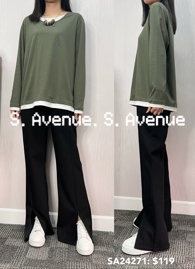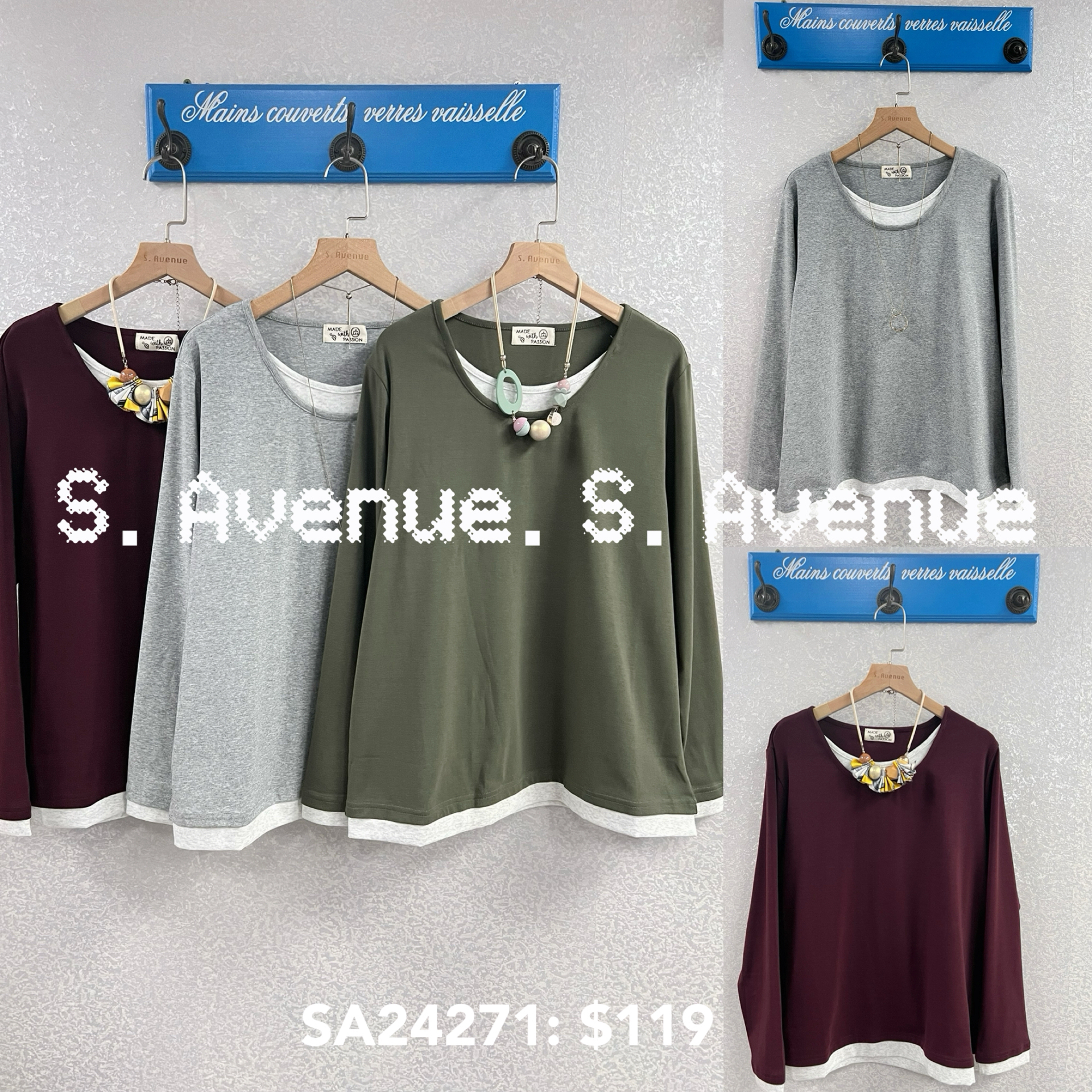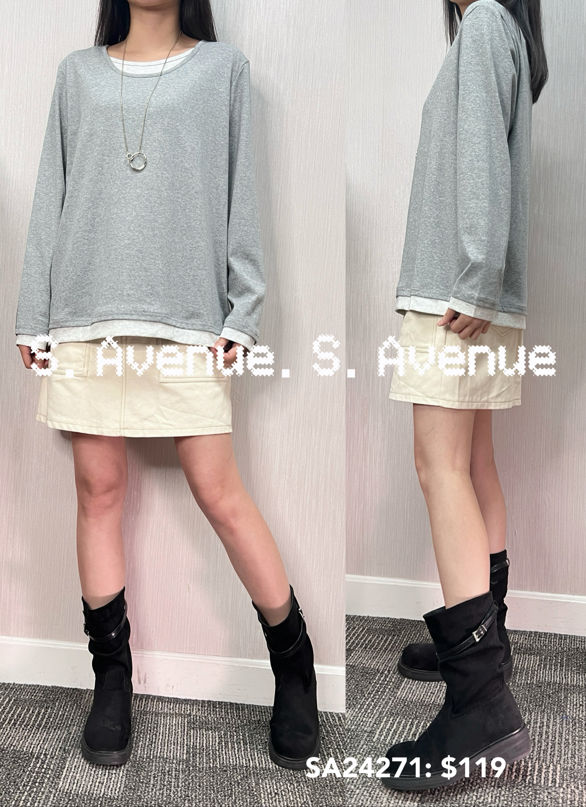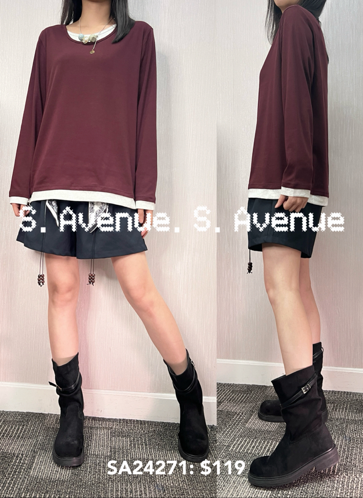 SA24271: 長袖淨色假兩件tee,質地是軟棉 顏色: 灰,綠,早紅 Price: $119 One size: 適合m至L碼的身型,布料有彈性 尺寸:上圍42吋,腰42吋,長24吋 (尺寸只供參考,每人度均有不同,請預一至兩吋走盞)