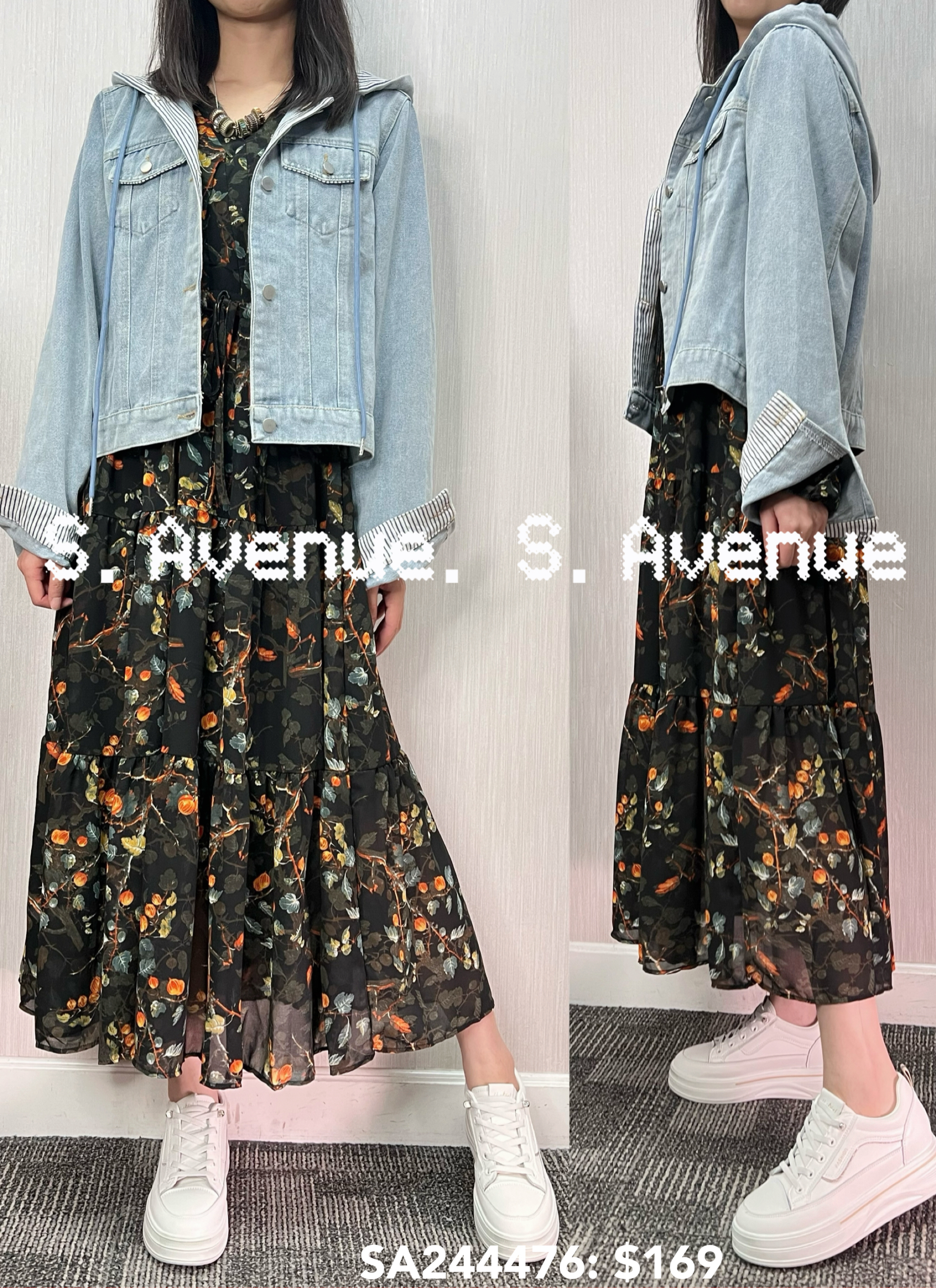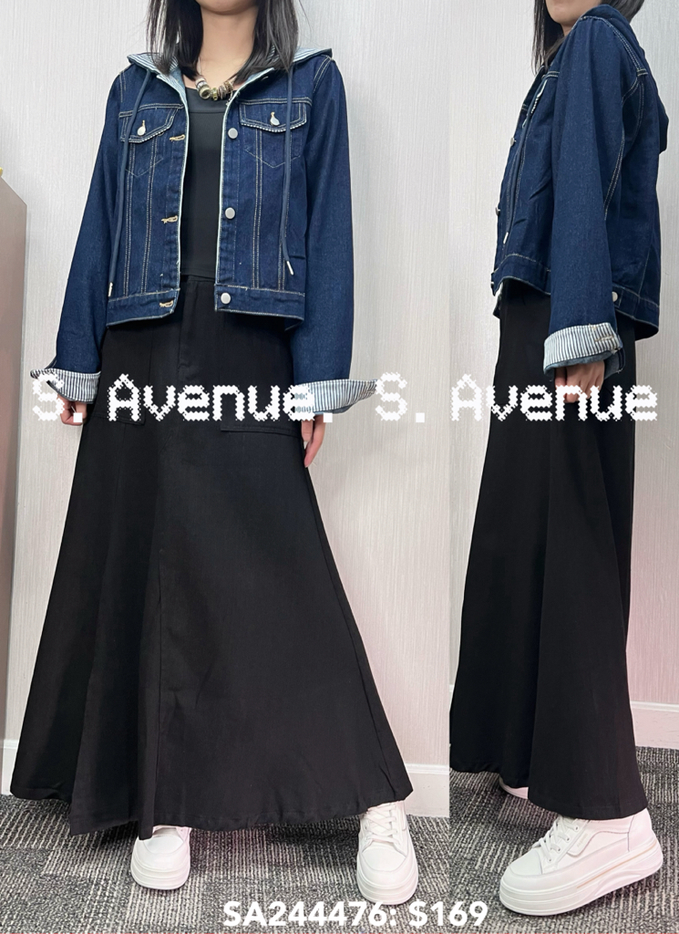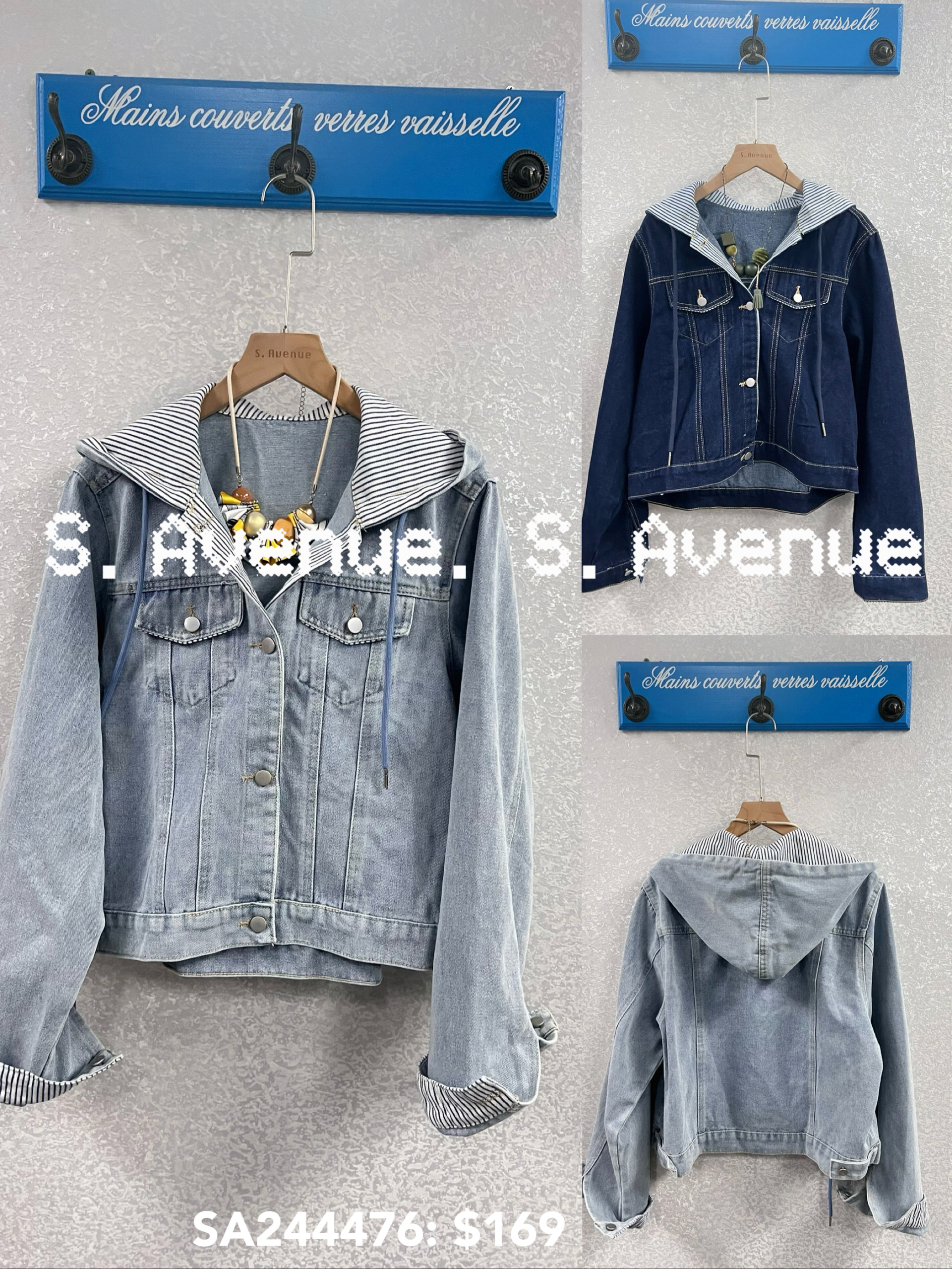 SA244476: 長袖有帽拼直條牛仔褸,質地是牛仔,靚款 顏色: 深,淺 Price: $169 One size: 適合m至L碼的身型,布料沒有彈性 尺寸:上圍40吋,腰40吋,長20吋 (尺寸只供參考,每人度均有不同,請預一至兩吋走盞)