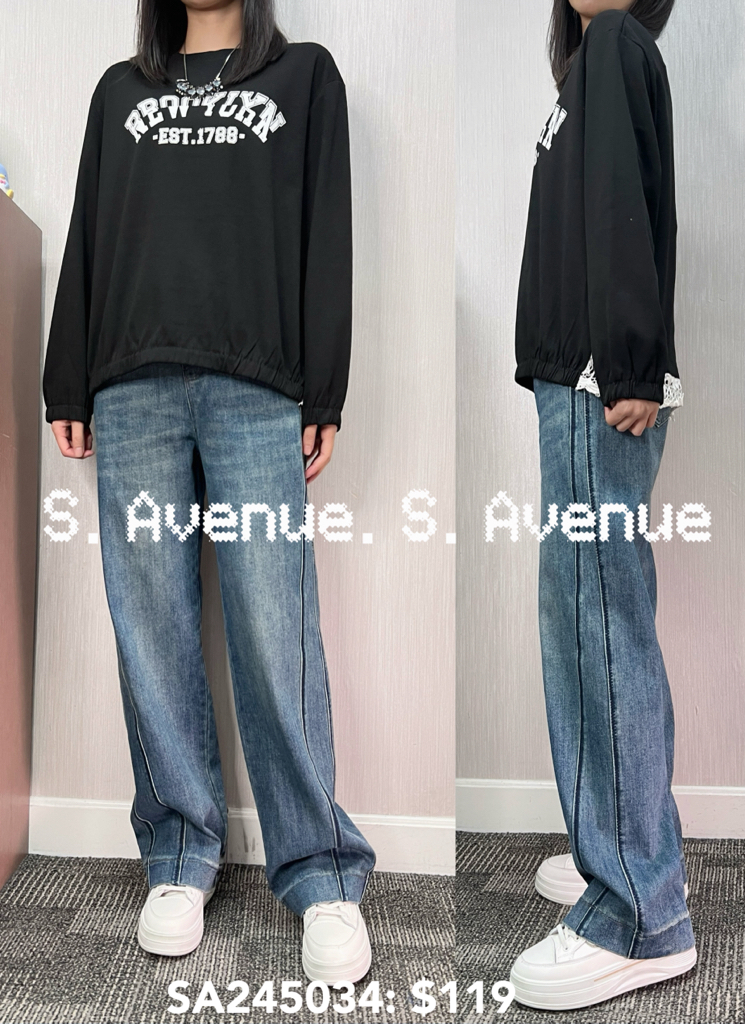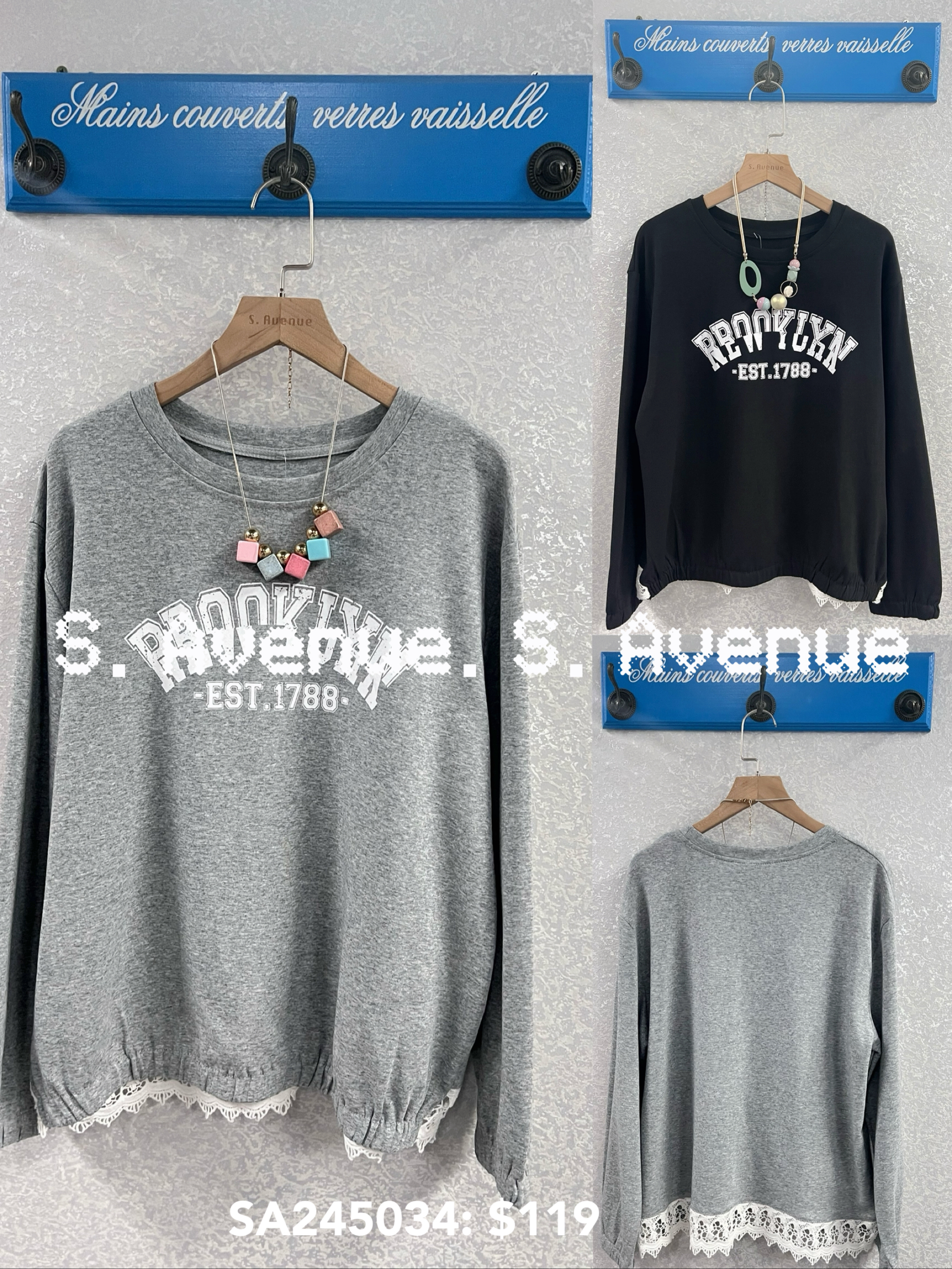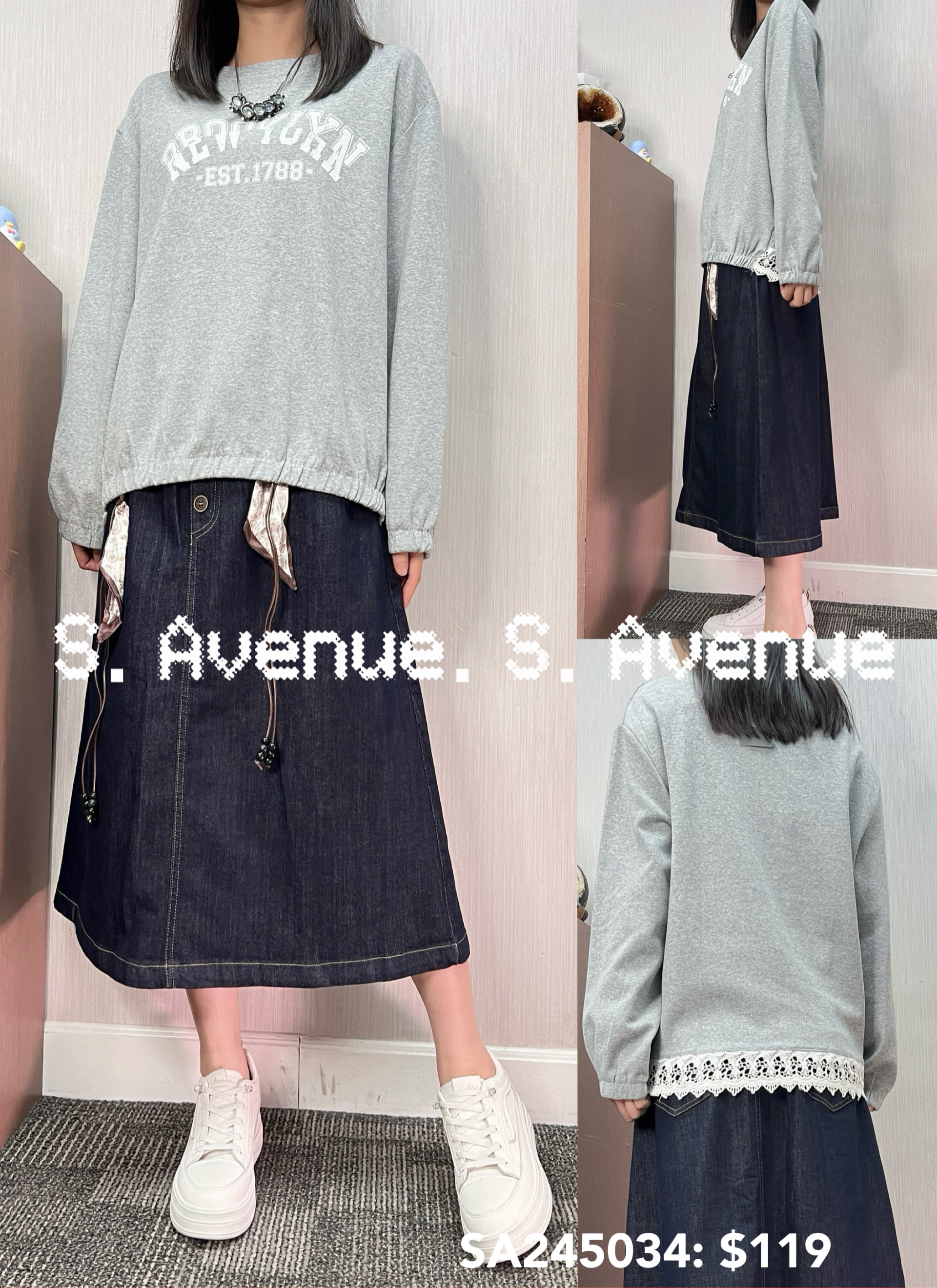 SA245034: 長袖英文字後lace tee質地是棉 顏色: 藍,灰 Price: $119 One size: 適合m至L碼的身型,布料有彈性 尺寸:上圍44吋,腰40」吋,長22吋 (尺寸只供參考,每人度均有不同,請預一至兩吋走盞)