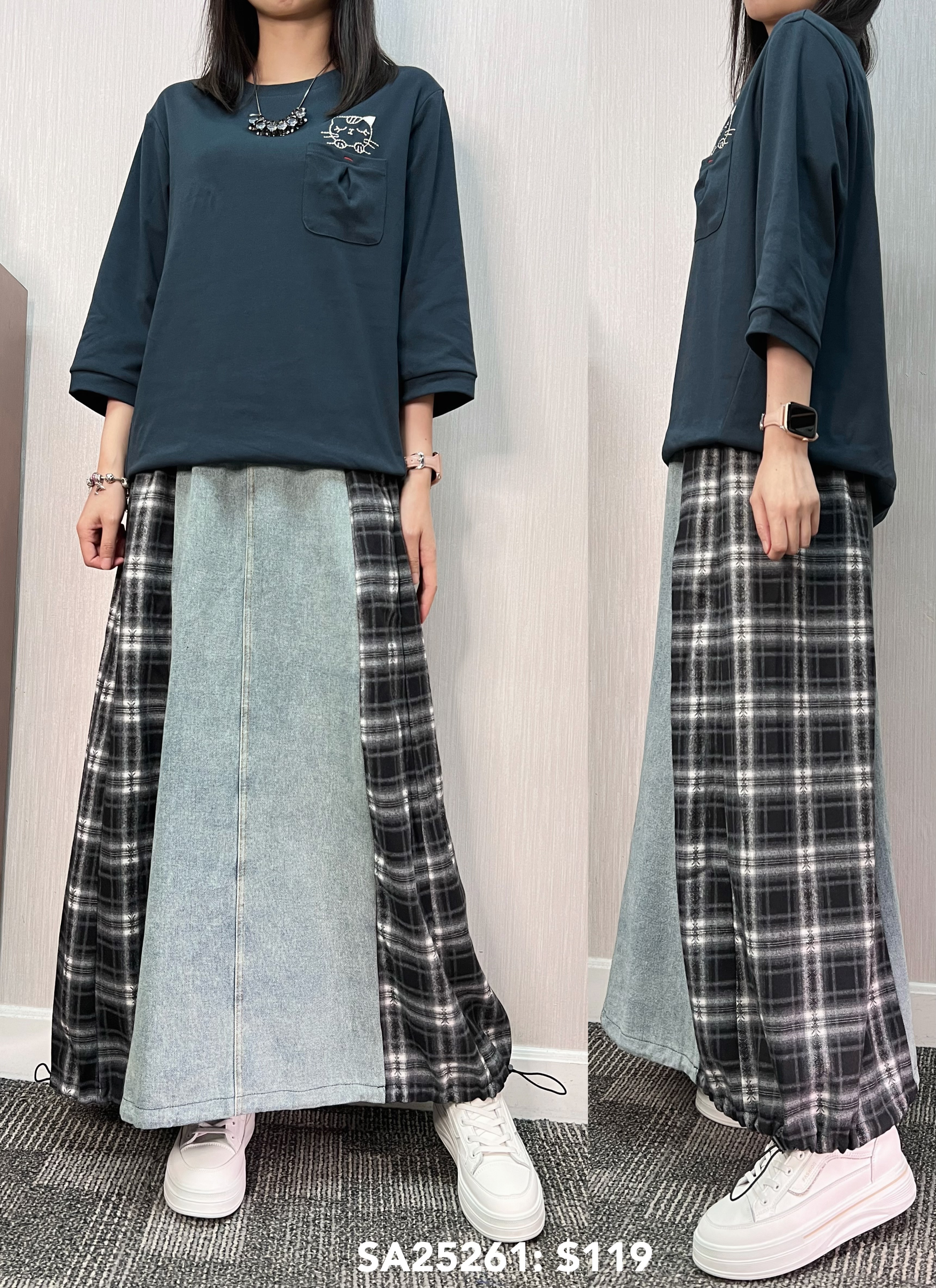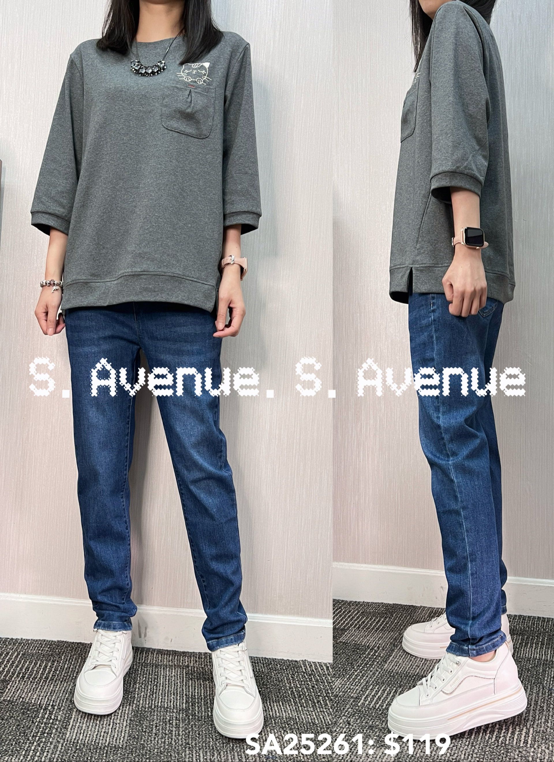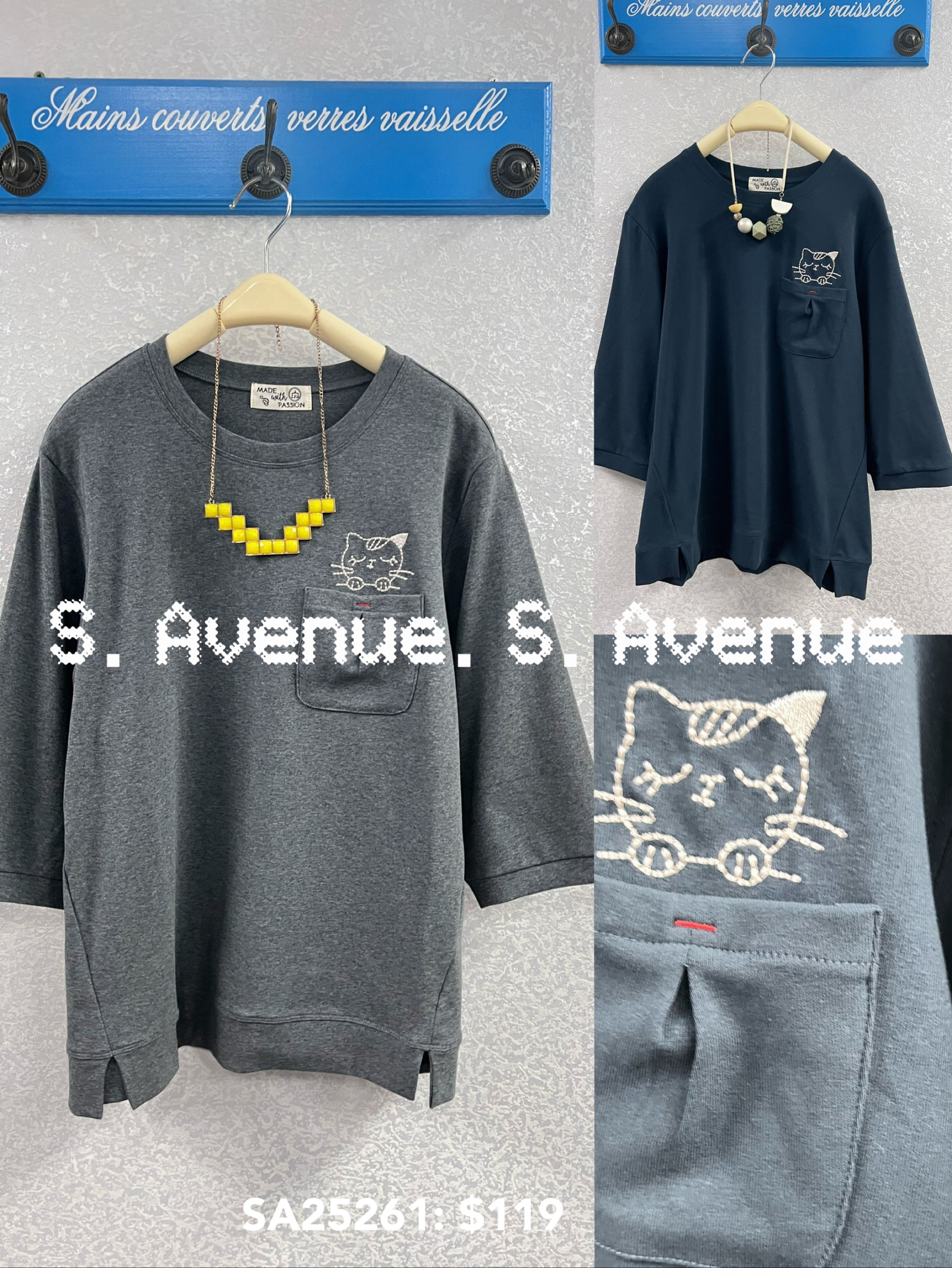 SA25261: 中袖假袋繡貓tee 質地是棉 顏色: 灰,藍 Price: $119 One size: 適合m至L碼的身型,布料有彈性 尺寸:上圍42吋,腰42吋,長24吋 (尺寸只供參考,每人度均有不同,請預一至兩吋走盞)
