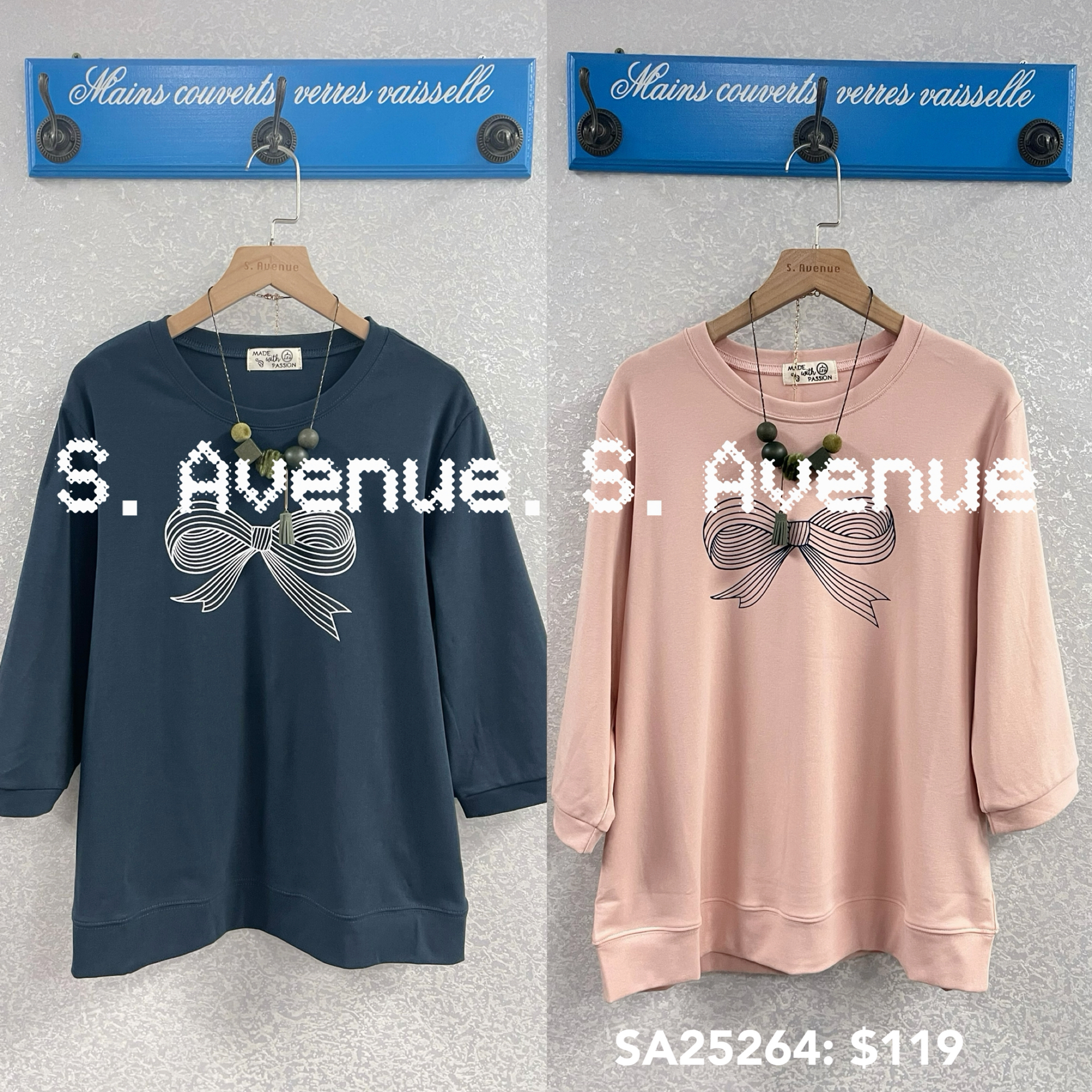 SA25264: 中袖蝴蝶結tee,質地是軟身靚棉,靚料簡約款 顏色: 藍,粉 Price: $119 One size: 適合m至L碼的身型,布料有彈性 尺寸:上圍40吋,腰40吋,長24吋 (尺寸只供參考,每人度均有不同,請預一至兩吋走盞)
