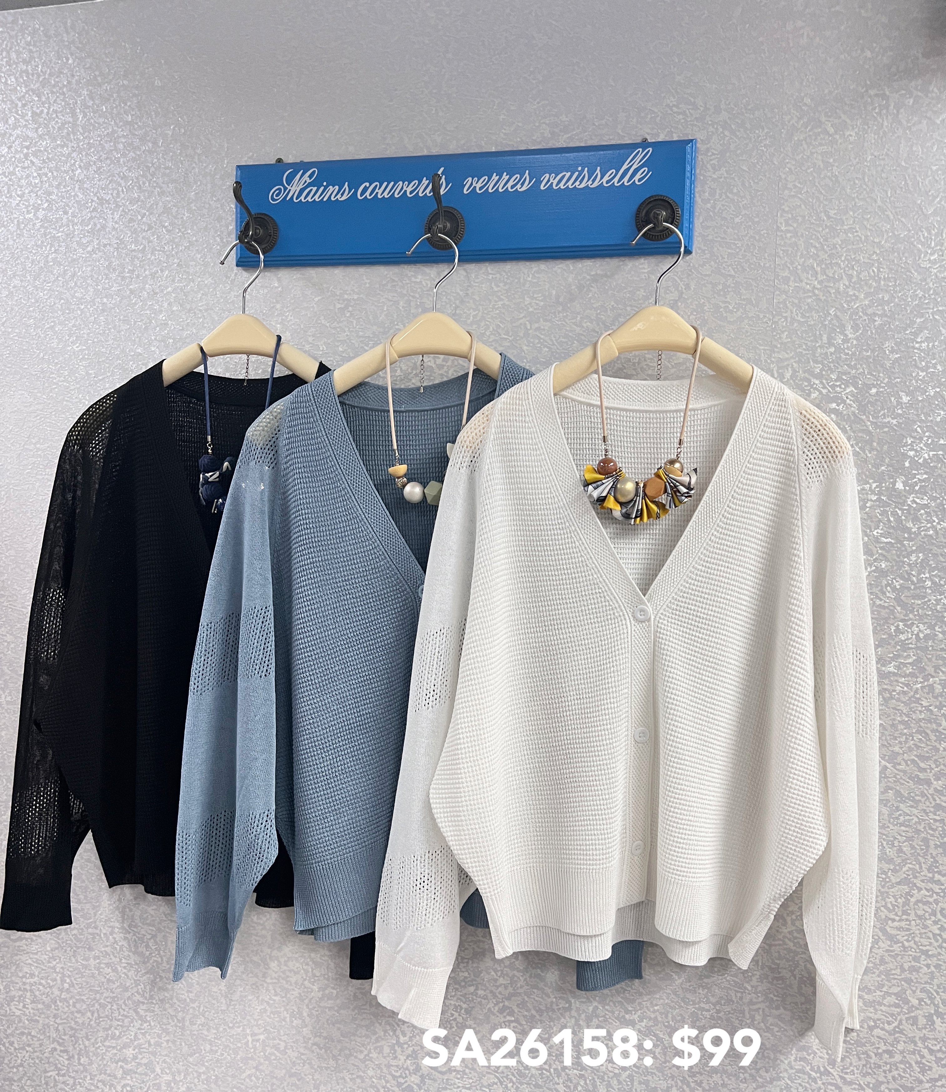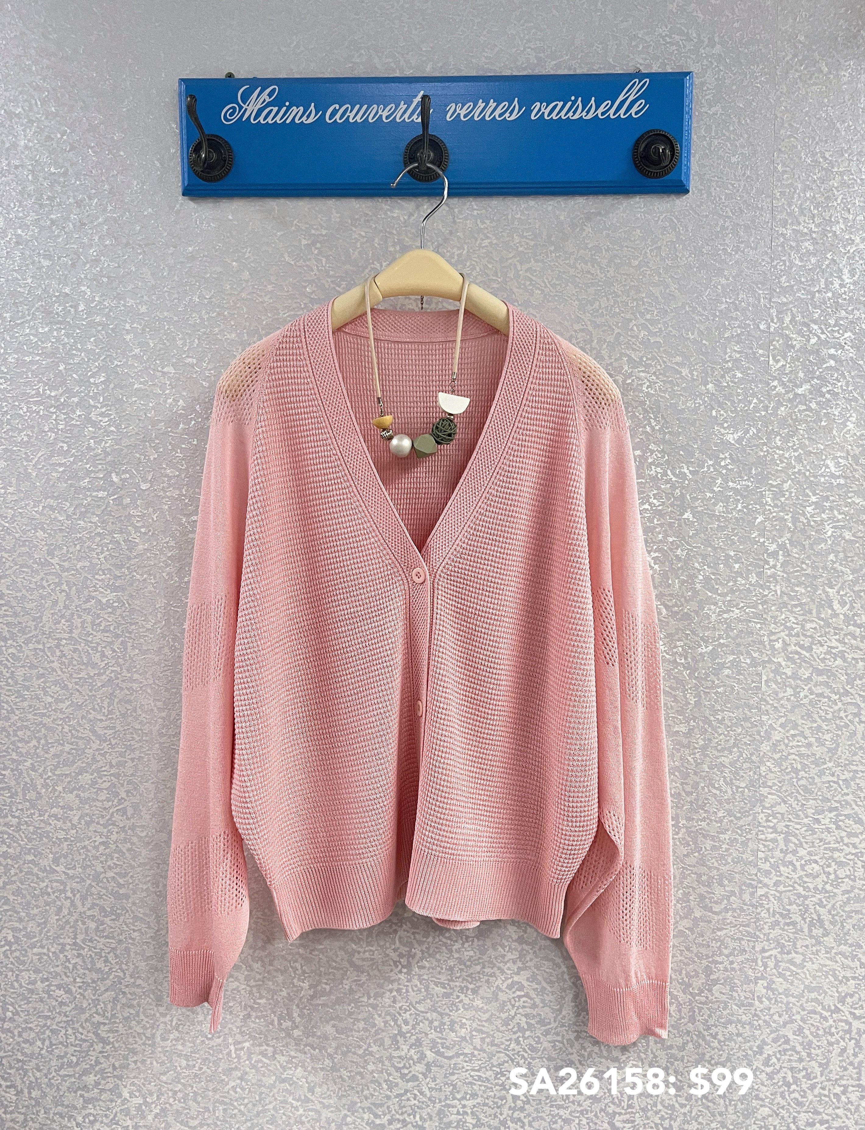 SA26158: 長袖線料有鈕外套,質地是線料 顏色: 黑,淺藍,白,粉 Price: $99 One size: 適合m至L碼的身型,布料有彈性 尺寸:上圍44吋,腰40吋,長21吋 (尺寸只供參考,每人度均有不同,請預一至兩吋走盞)