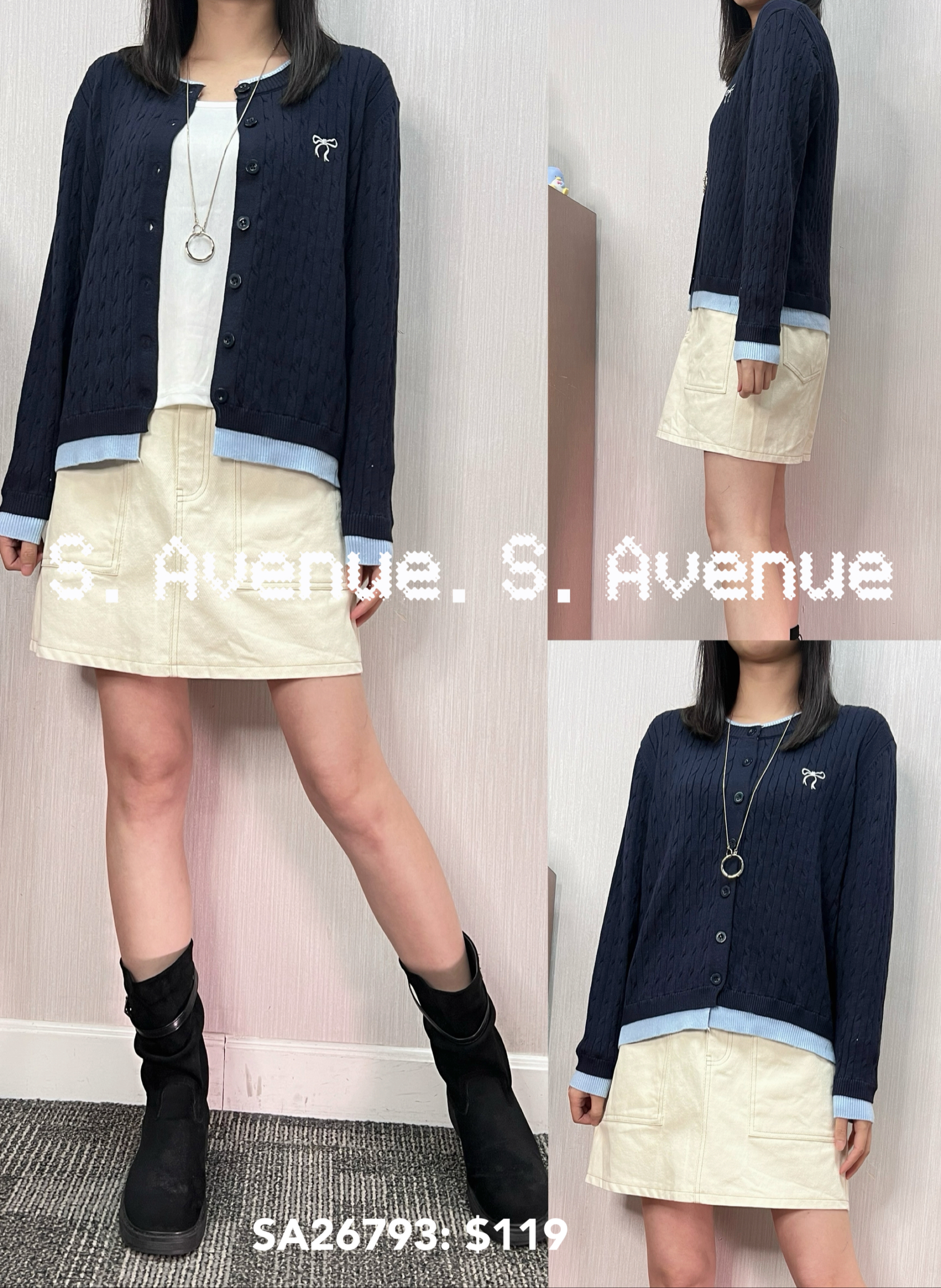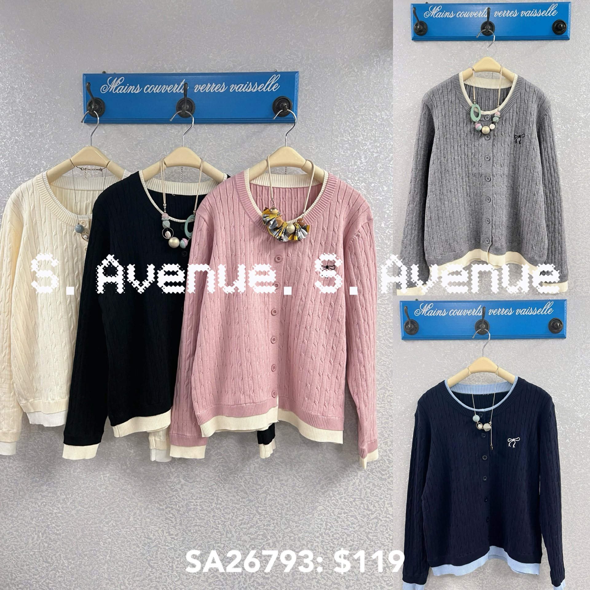 SA26793: 長袖撞色邊假兩件繡蝴蝶結鈕紋軟冷外套,質地是薄軟冷料,質地舒服,多色選擇,推介款❣️ 顏色: 黑,粉,灰,杏,深藍 Price: $ 119 One size: 適合m至L碼的身型,布料有彈性 尺寸:上圍42吋,腰40吋,長21吋 (尺寸只供參考,每人度均有不同,請預一至兩吋走盞)