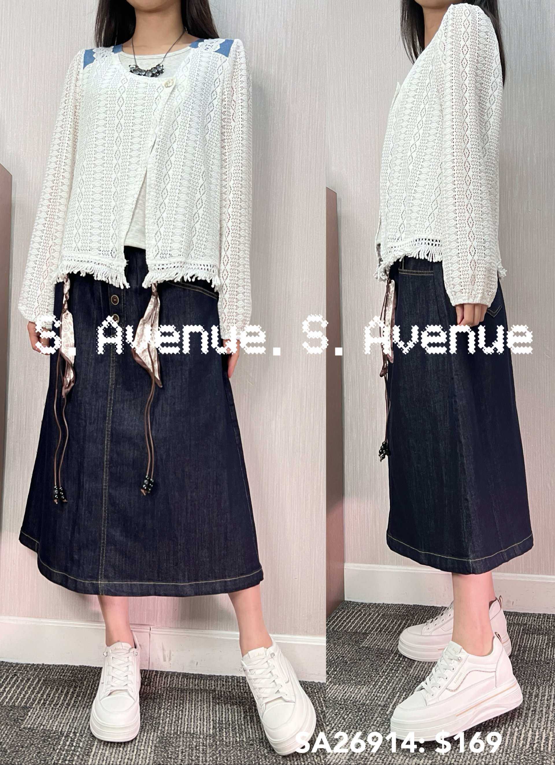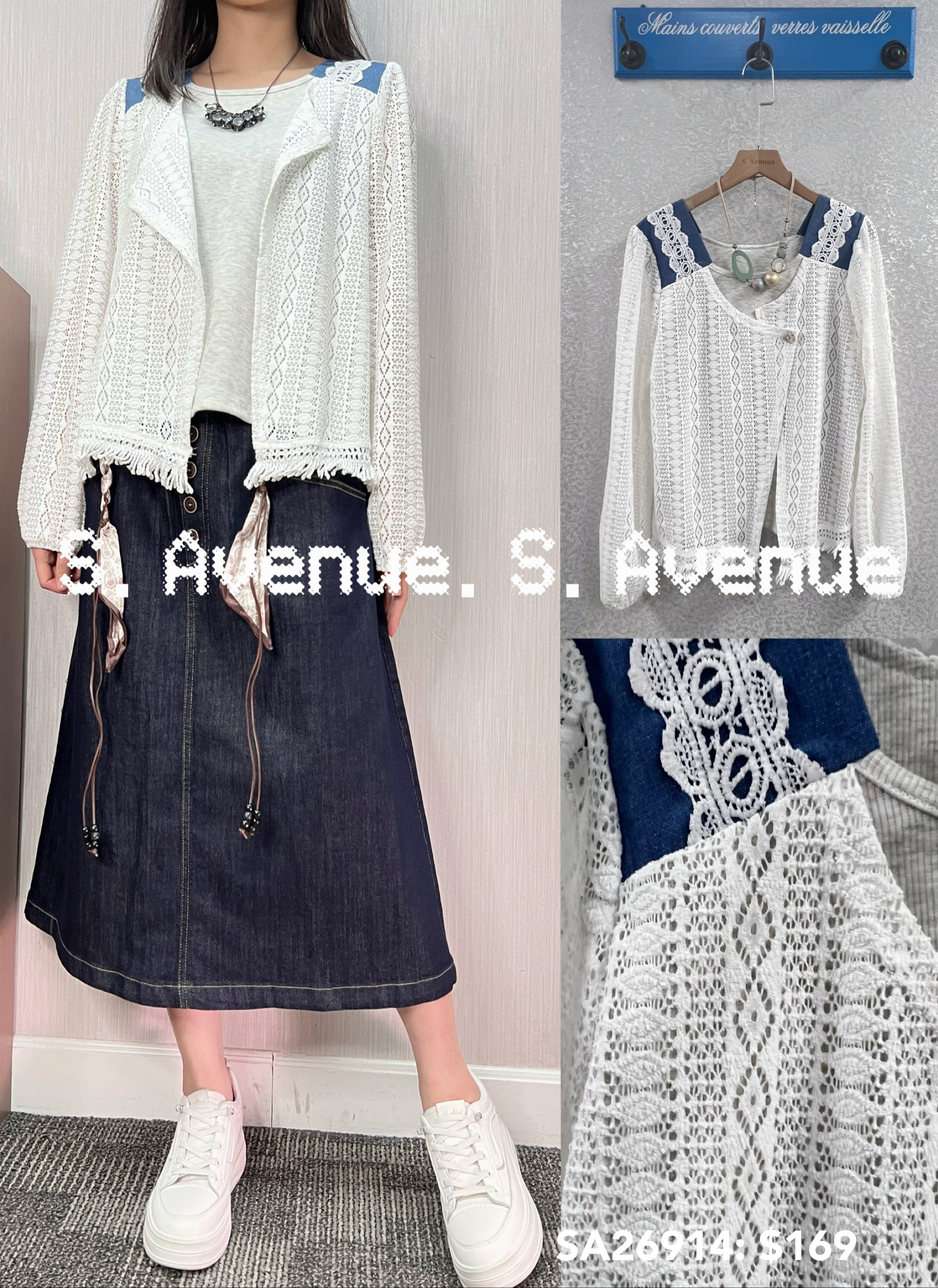 SA26914: 長袖網lace膊牛仔假兩件top,質地是網織lace,超顯瘦靚料靚款🌈🌈 顏色: 白 Price: $169 One size: 適合m至L碼的身型,布料沒有彈性 尺寸:上圍40吋,腰42吋,長24吋 (尺寸只供參考,每人度均有不同,請預一至兩吋走盞)