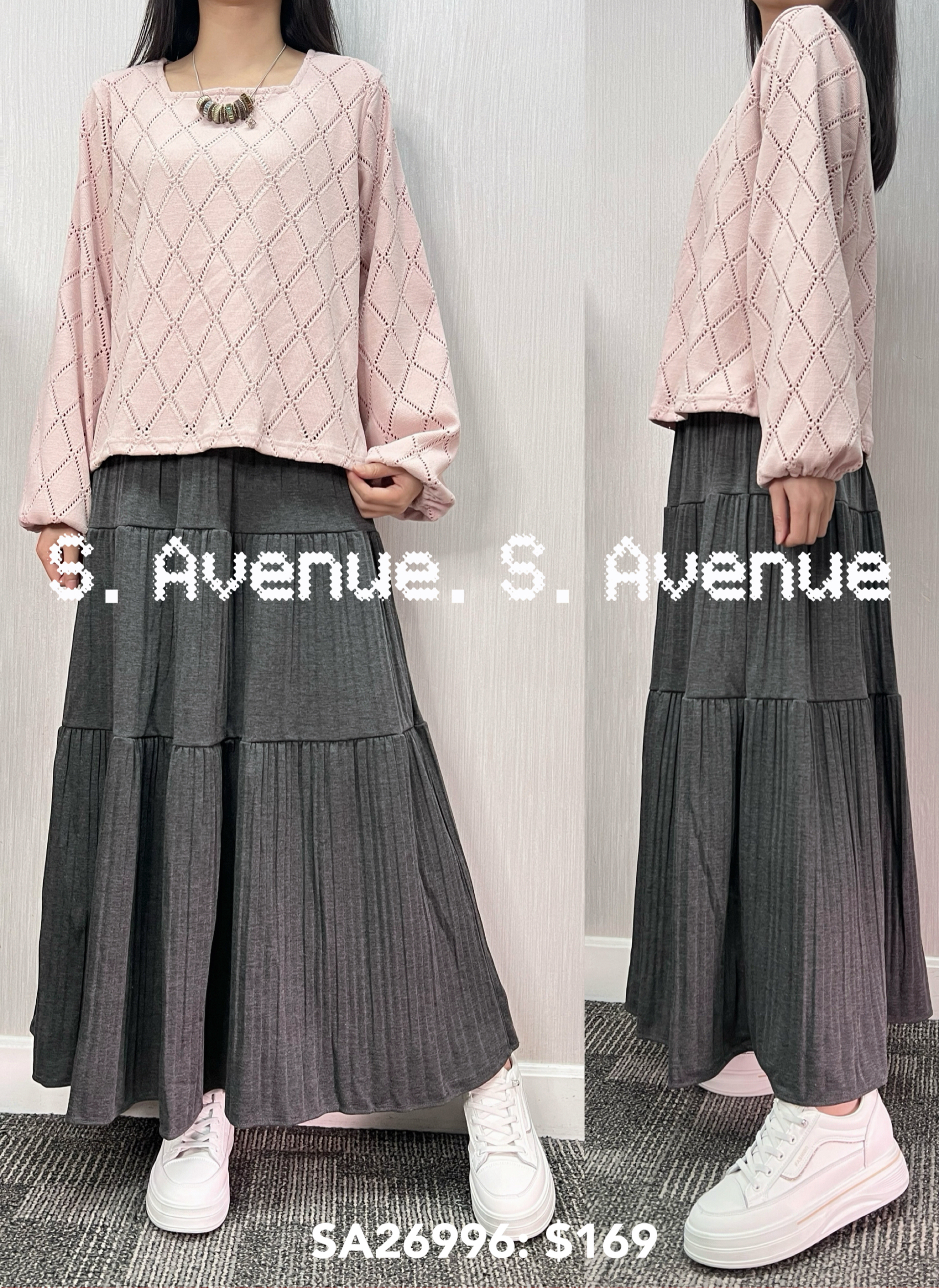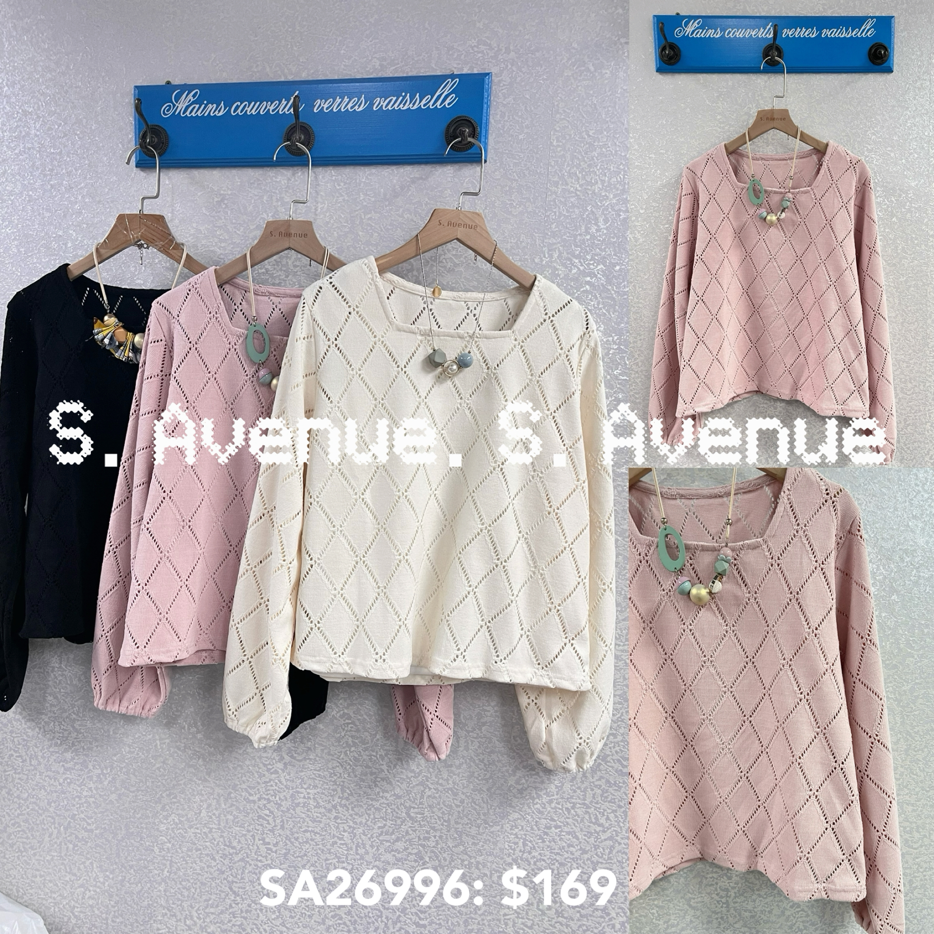 SA26996: 長袖方領暗菱格top,質地是暗紋top,內有吊帶背心不透 顏色: 白,黑,粉 Price: $169 One size: 適合m至L碼的身型,布料有彈性 尺寸:上圍42吋,腰42吋,長21吋 (尺寸只供參考,每人度均有不同,請預一至兩吋走盞)