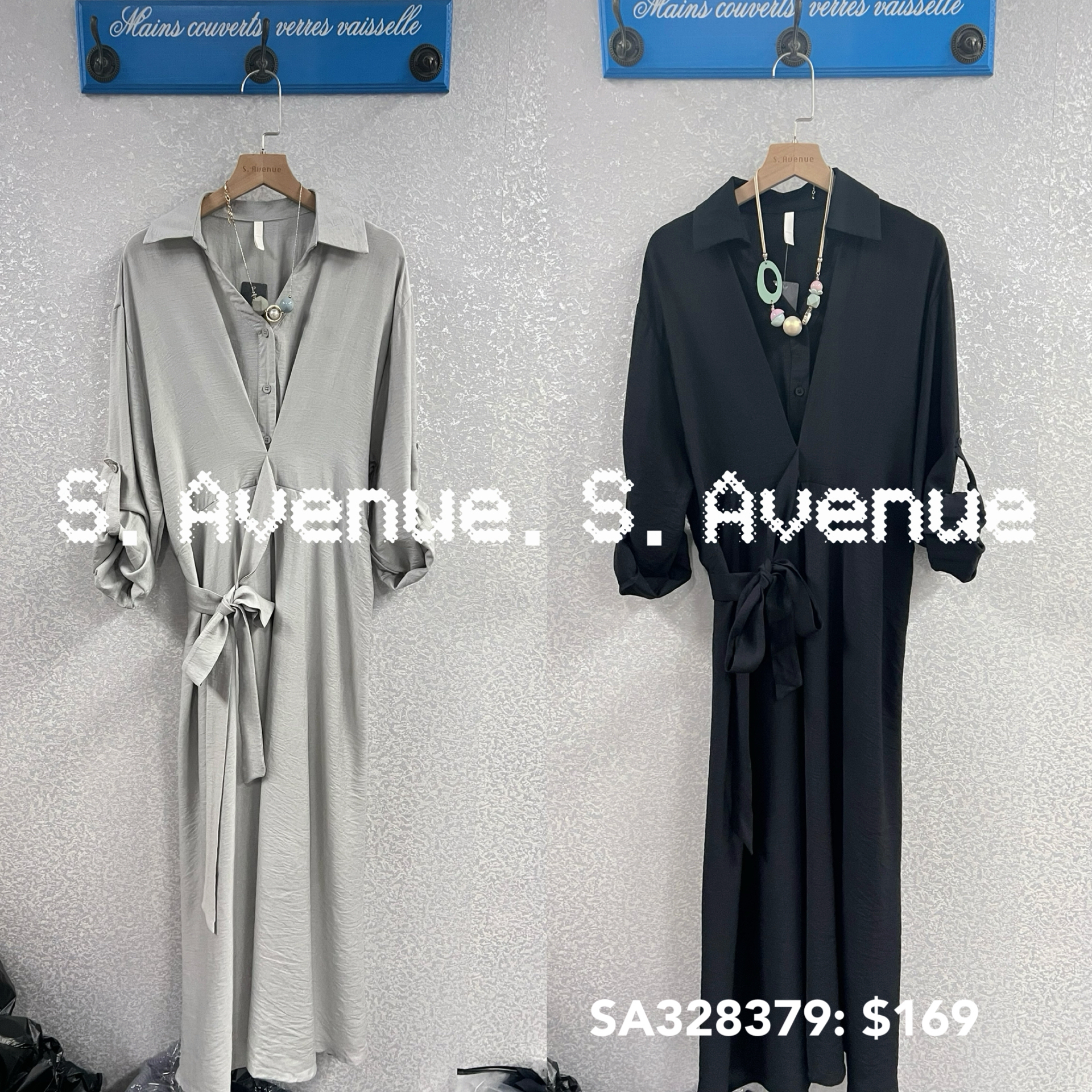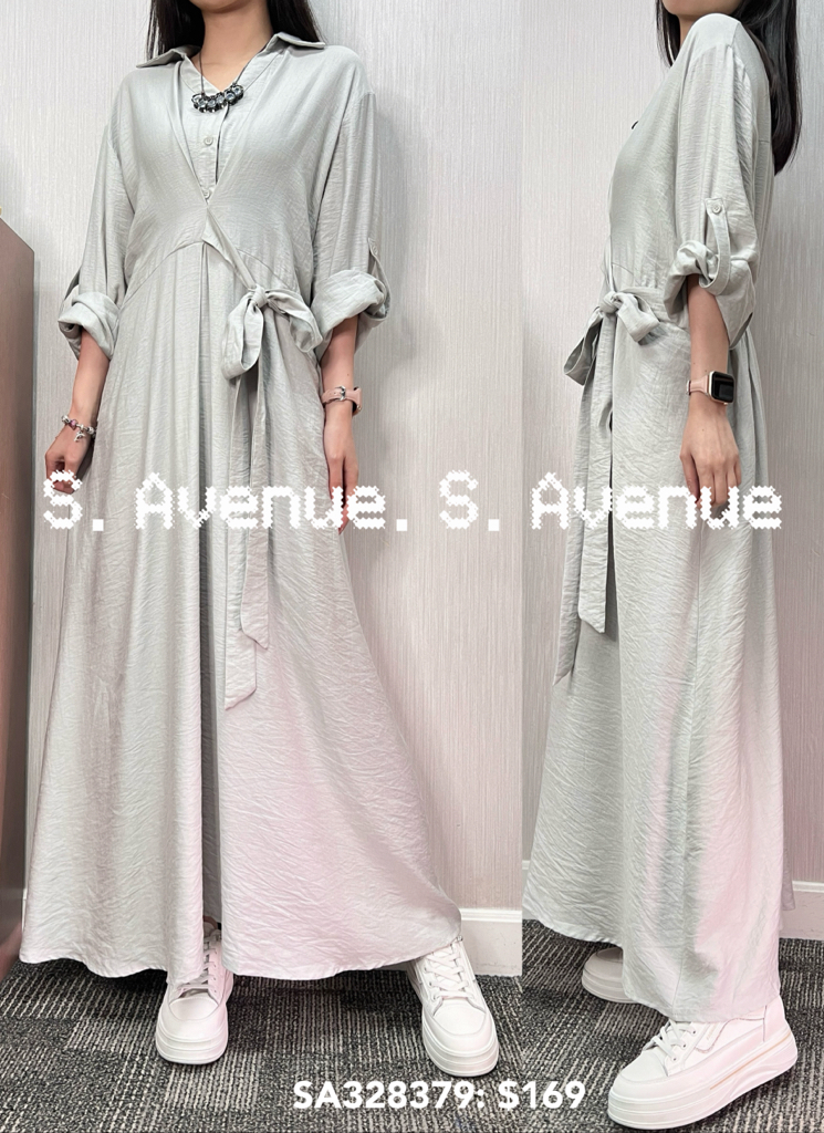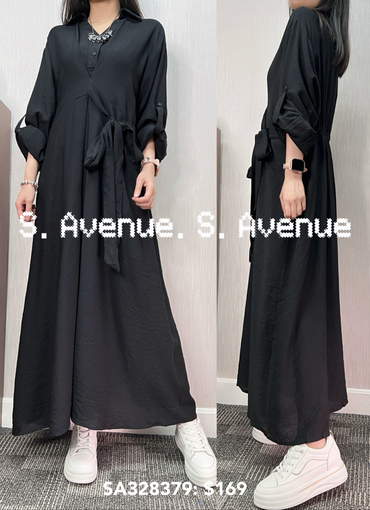 SA328379: 長袖有領側打結長裙,質地是暗紋雪紡 顏色: 灰藍,黑 Price: $169 One size: 適合m至L碼的身型,布料沒有彈性 尺寸:上圍44吋,腰40吋,hip56吋,長49吋 (尺寸只供參考,每人度均有不同,請預一至兩吋走盞)