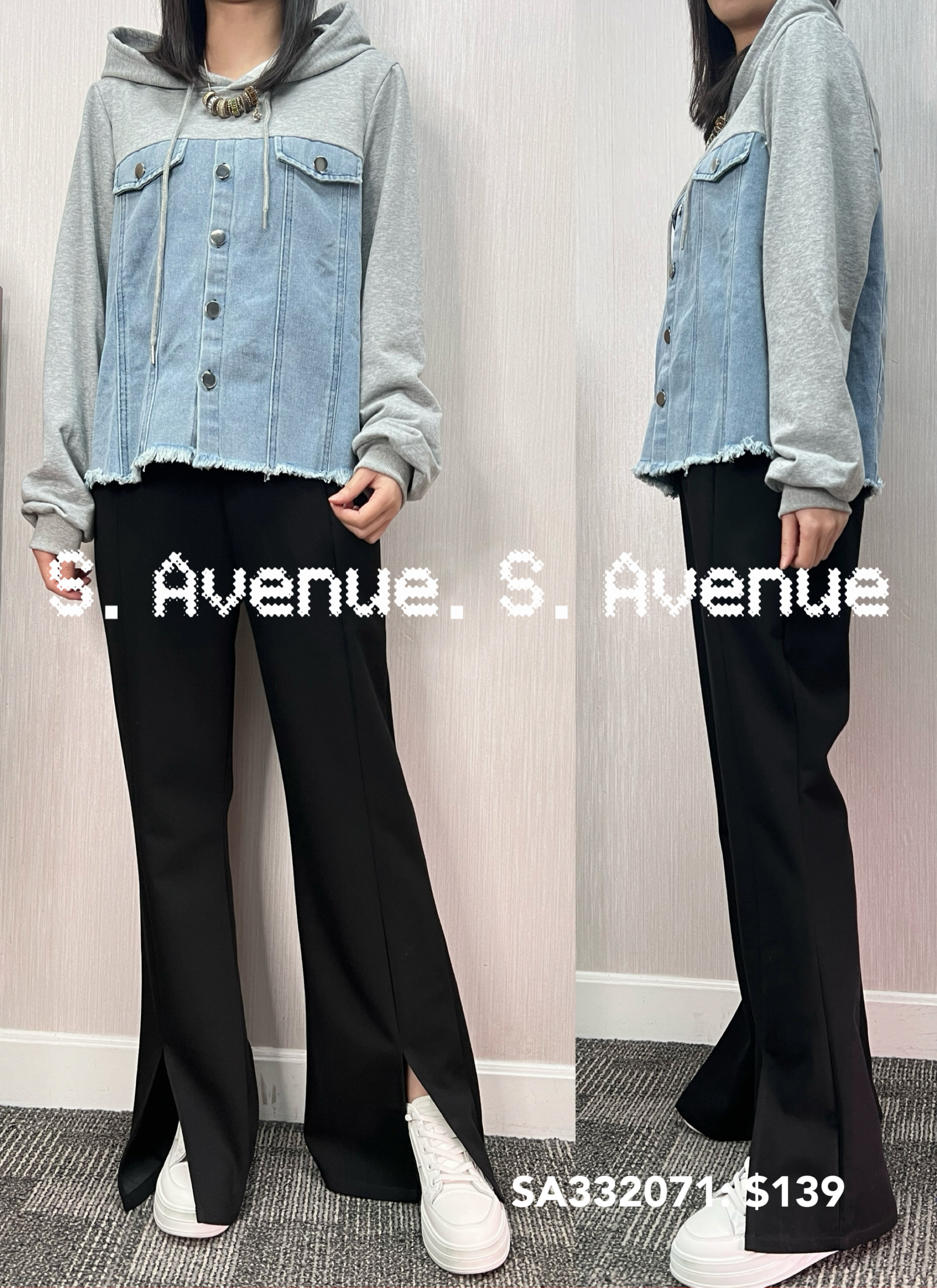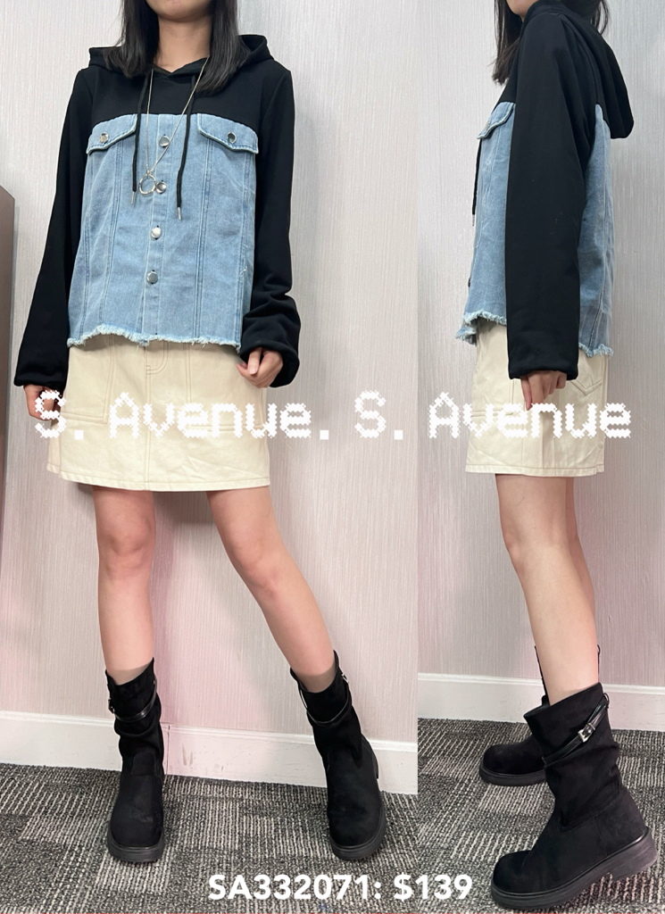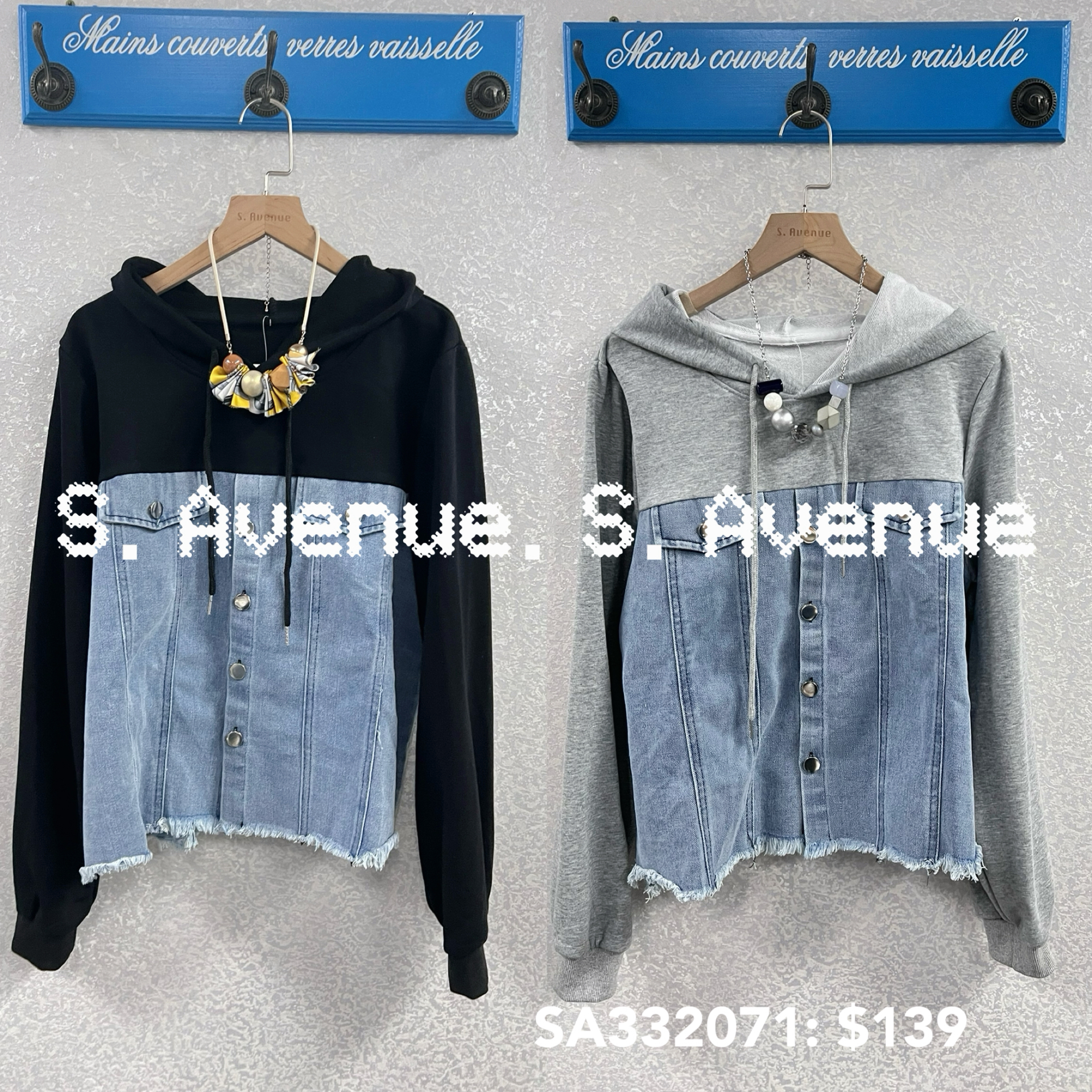 SA332071: 長袖有帽下有鈕牛仔tee,質地是牛仔拼棉 顏色: 灰,黑 Price: $139 One size: 適合m至L碼的身型,布料沒有彈性 尺寸:上圍42吋,腰42吋,長23吋 (尺寸只供參考,每人度均有不同,請預一至兩吋走盞)