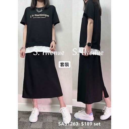 SA51263: 短袖英文字拼白tee配半截橡根腰雙袋後開叉裙套裝,質地是棉,可分開配襯,有真袋,靚cut靚款 顏色:灰,黑 Price: $189 One size: 適合m碼至L碼身型,布料有彈性 尺寸:衫:上圍40吋,腰40吋,長24吋 裙:腰26-42吋,hip42吋,長29吋 (尺寸只供參考,每人度均有不同,請預一至兩吋走盞)