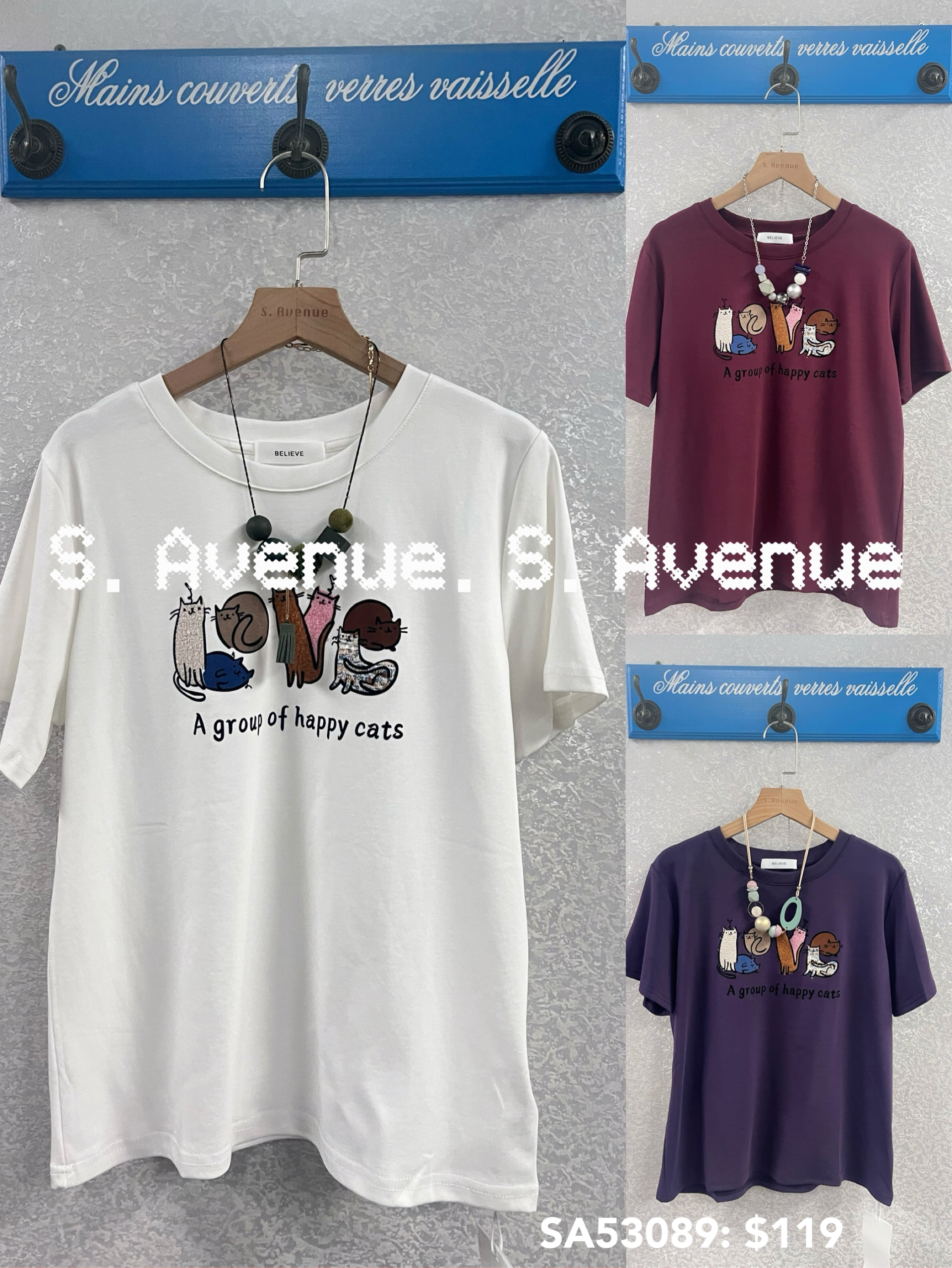 SA52089: 短袖四隻love貓貓tee,質地是靚棉 顏色: 白,紫,早紅 Price: $119 One size: 適合m至L碼的身型,布料有彈性 尺寸:上圍40吋,腰38吋,長23吋 (尺寸只供參考,每人度均有不同,請預一至兩吋走盞)