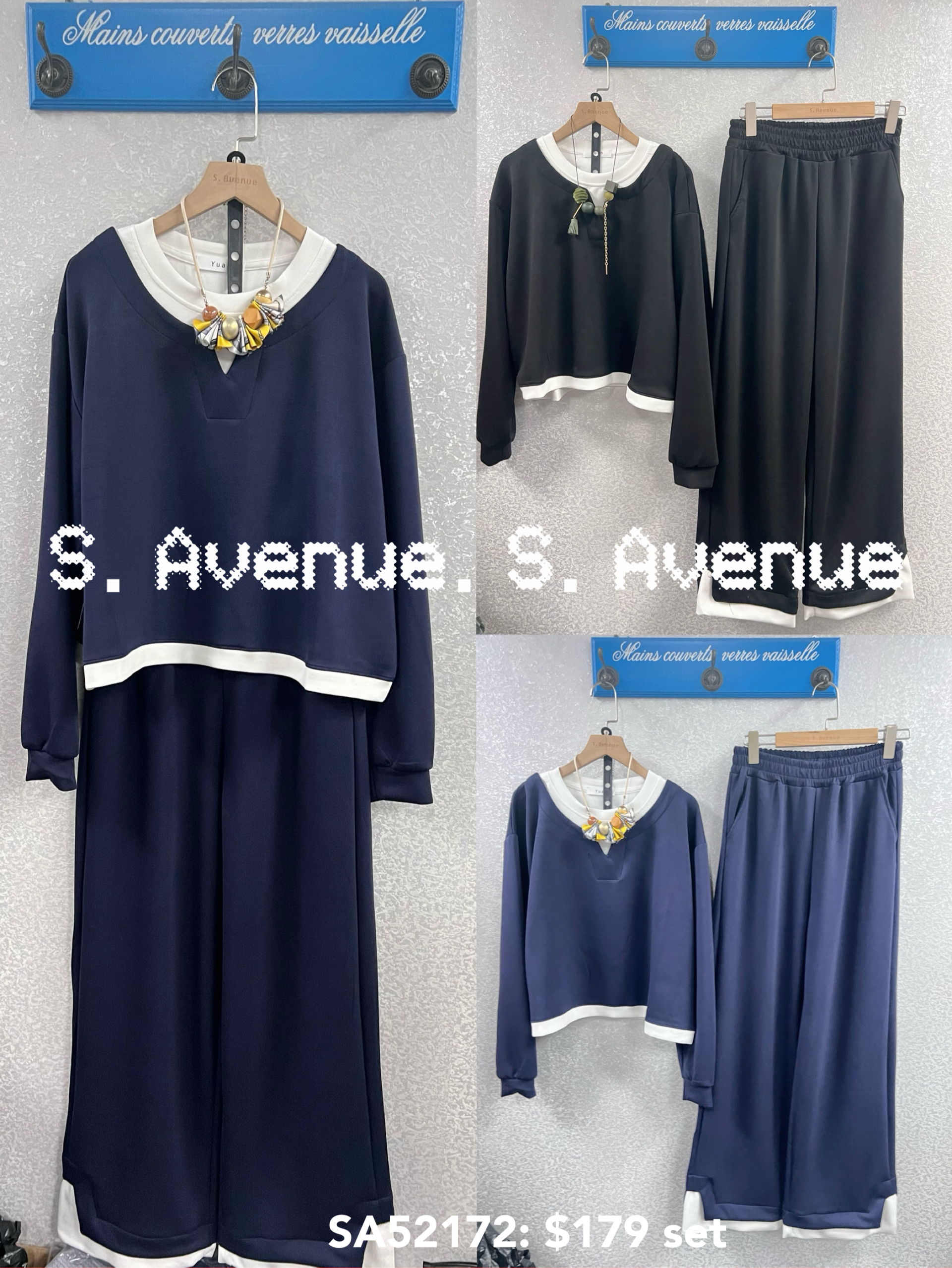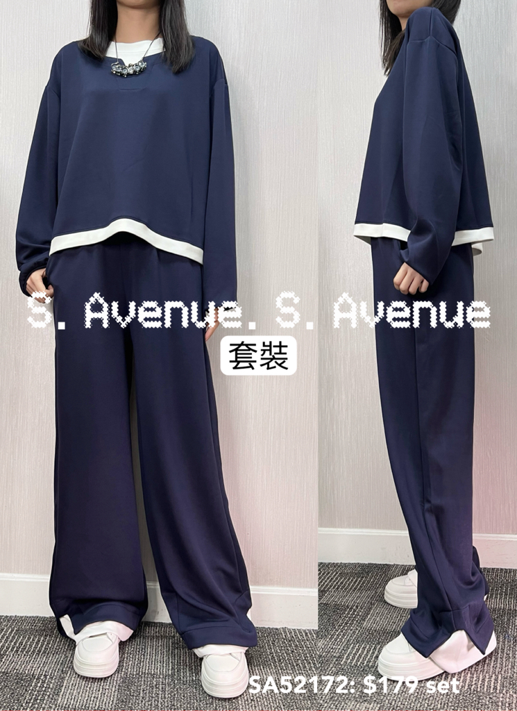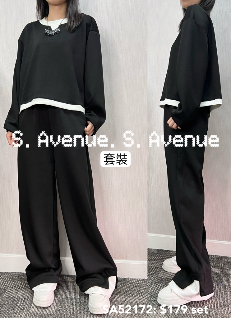 SA52172: 長袖假兩件鬆身tee配腳拼白長休閑褲,質地是空氣棉,褲橡筋腰,有真袋可分開配襯 顏色: 黑,深藍 Price: $179 One size: 適合m碼至L碼身型,布料有彈性 尺寸:上衣:上圍44吋,腰44吋,長21吋 褲,腰26-42吋,hip44吋,長41吋 (尺寸只供參考,每人度均有不同,請預一至兩吋走盞)