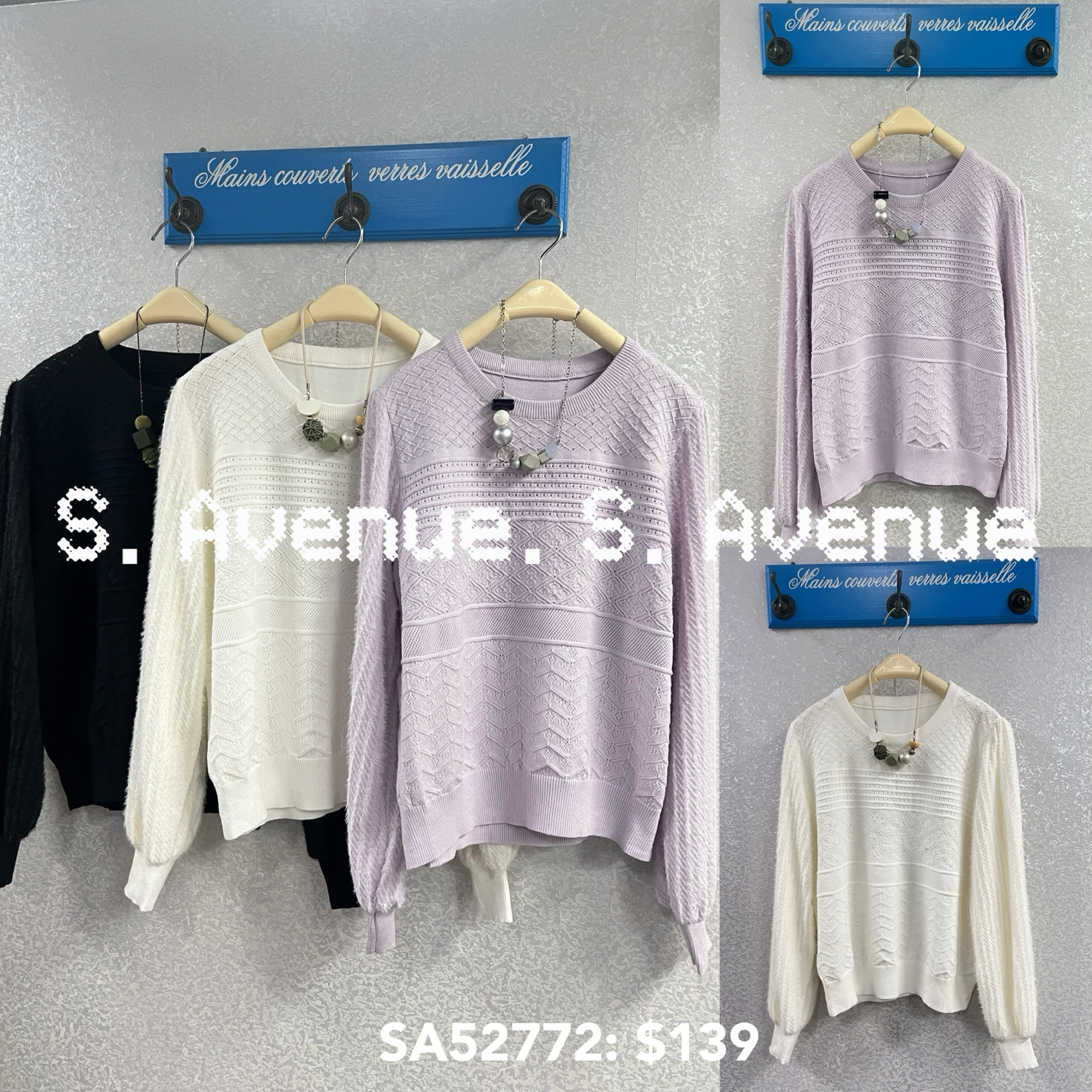 SA52772: 長袖菱格織紋top,質地是薄線冷 顏色: 白,粉紫,黑 Price: $139 One size: 適合m至L碼的身型,布料有彈性 尺寸:上圍40吋,腰40吋,長22吋 (尺寸只供參考,每人度均有不同,請預一至兩吋走盞)