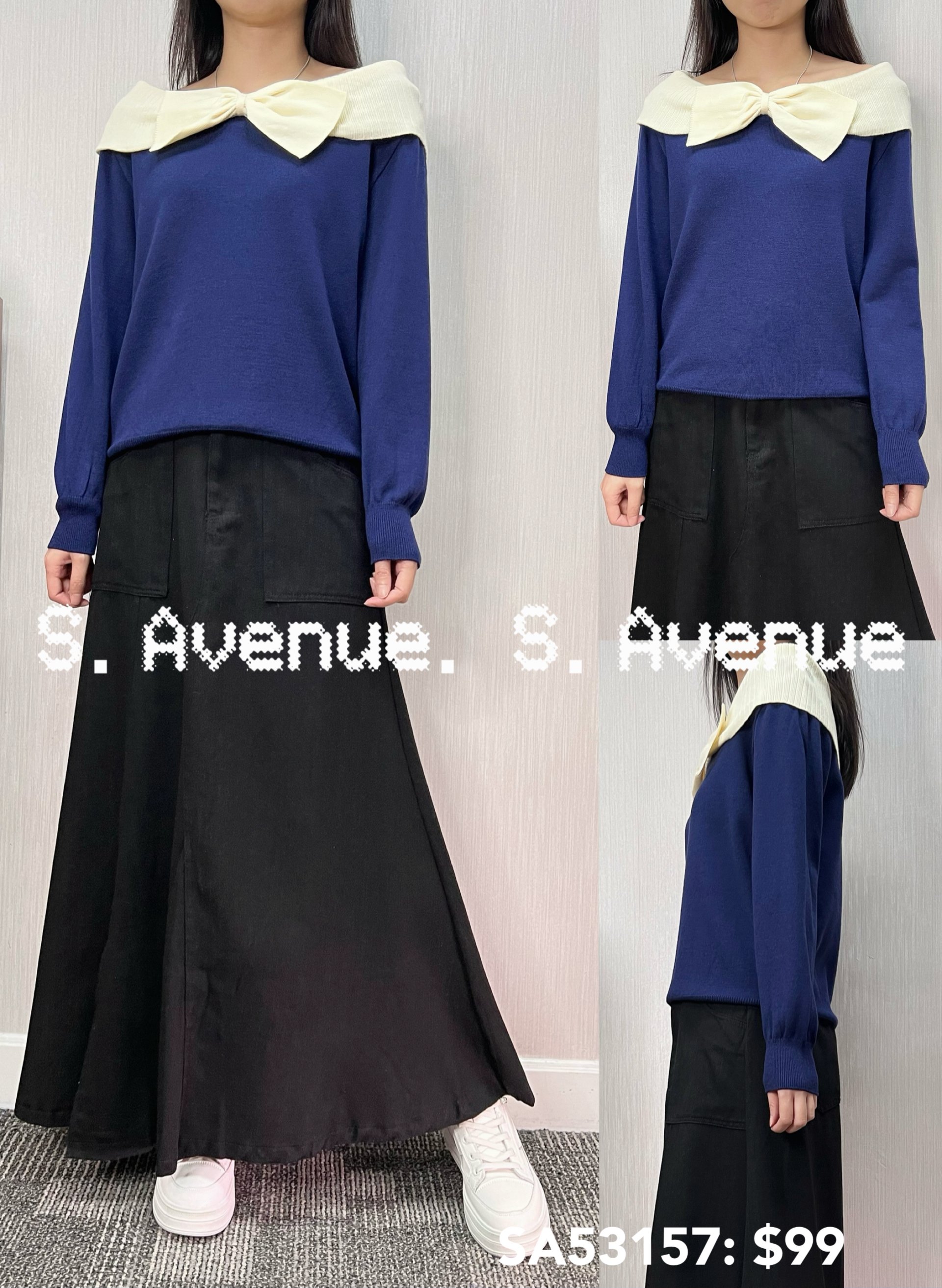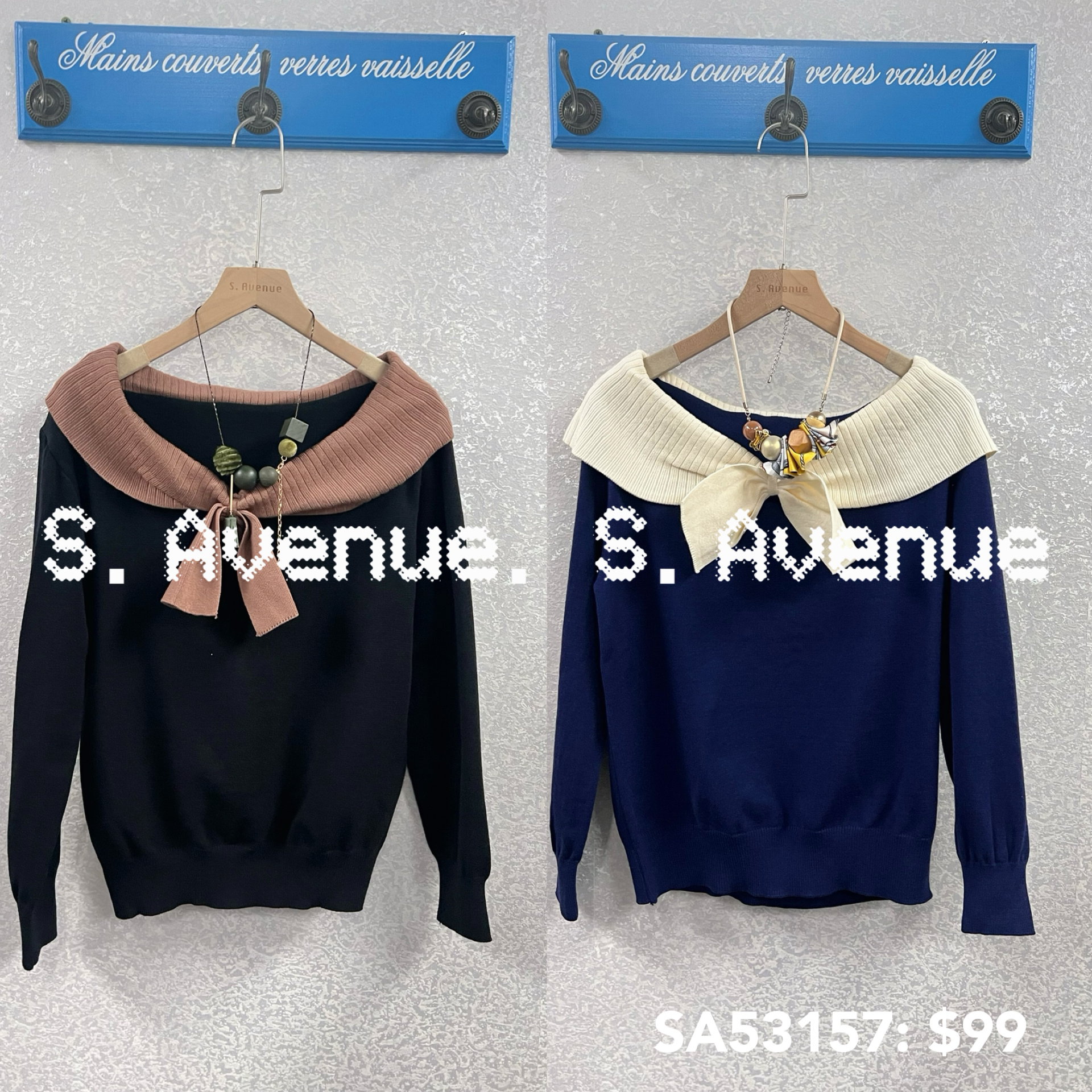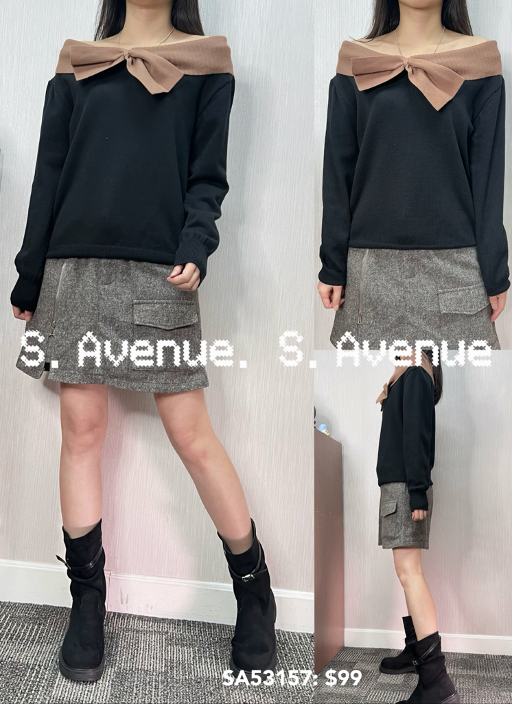 SA53157: 長袖領蝴蝶結線冷top,質地是線冷 顏色: 杏啡,藍啡 Price: $99 One size: 適合m至L碼的身型,布料有彈性 尺寸:上圍38吋,腰38吋,長23吋 (尺寸只供參考,每人度均有不同,請預一至兩吋走盞)