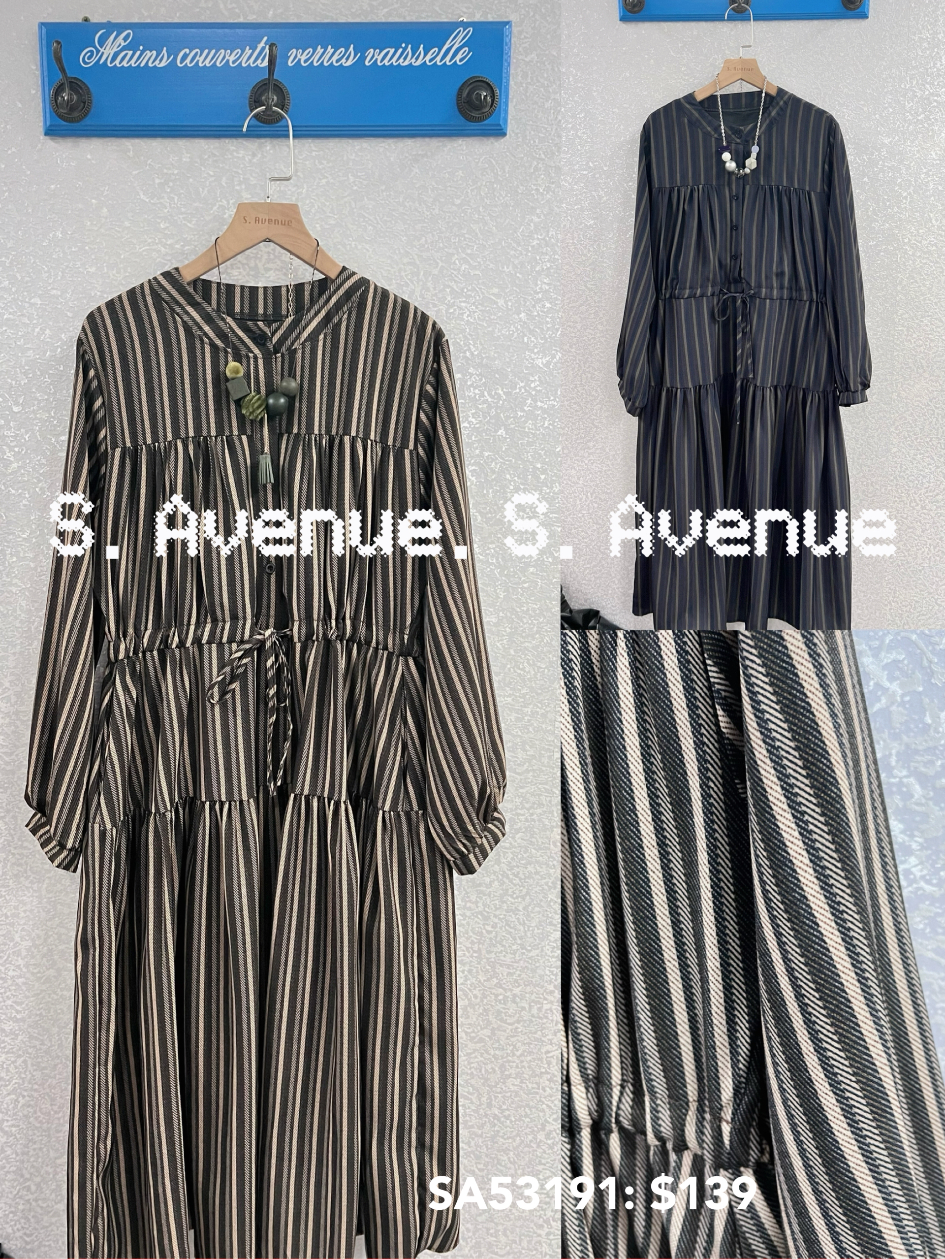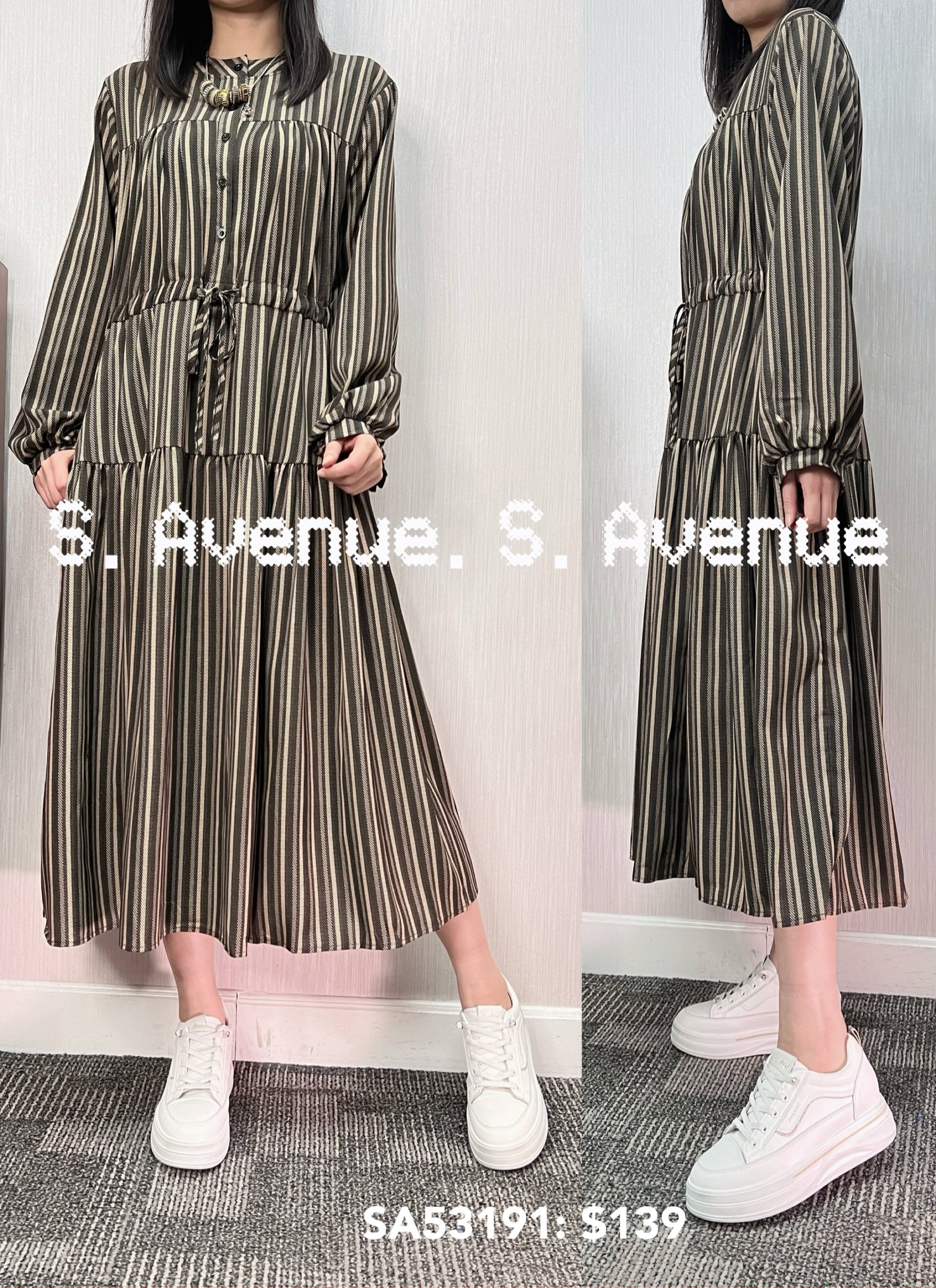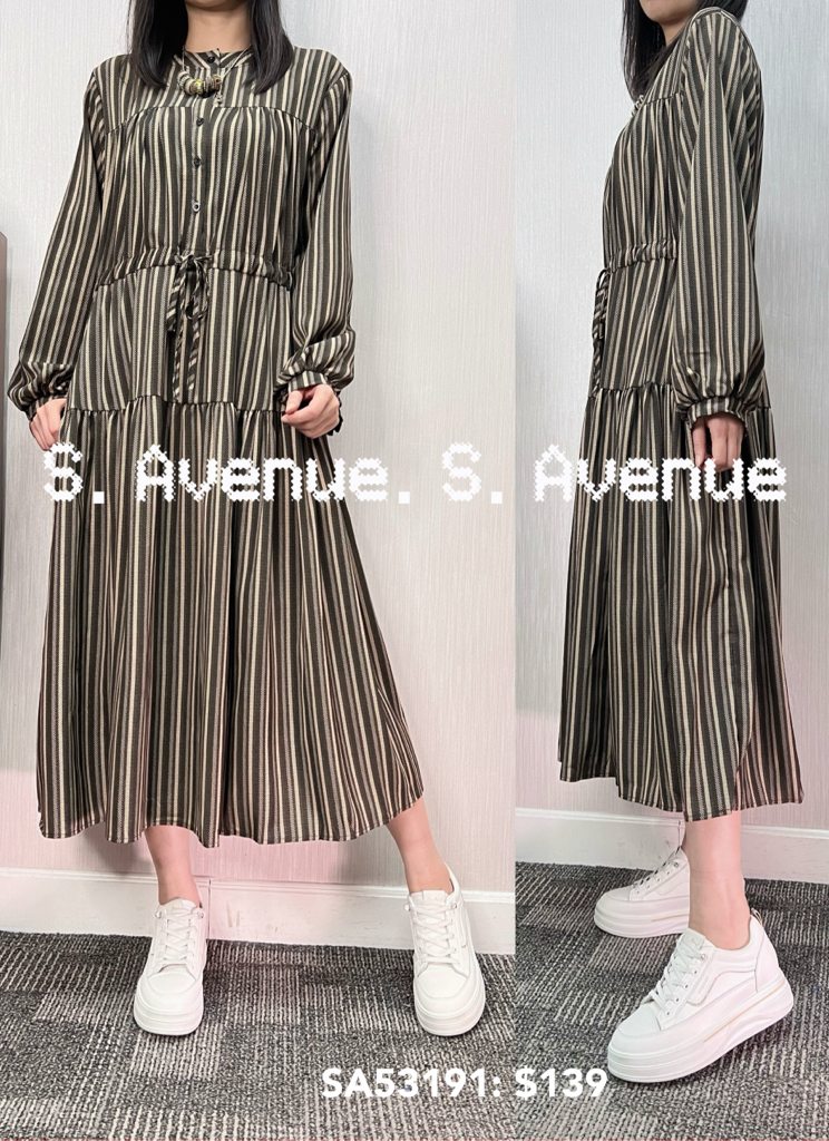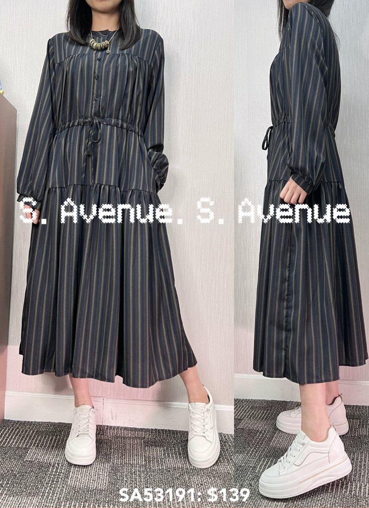 SA53191: 長袖前有鈕束腰直條裙,質地是滑身直條薄西布,有真袋和里布 顏色: 卡 ,藍 Price: $139 One size: 適合m至L碼的身型,布料沒有彈性 尺寸:上圍42吋,腰40吋,hip48吋,長44吋 (尺寸只供參考,每人度均有不同,請預一至兩吋走盞)