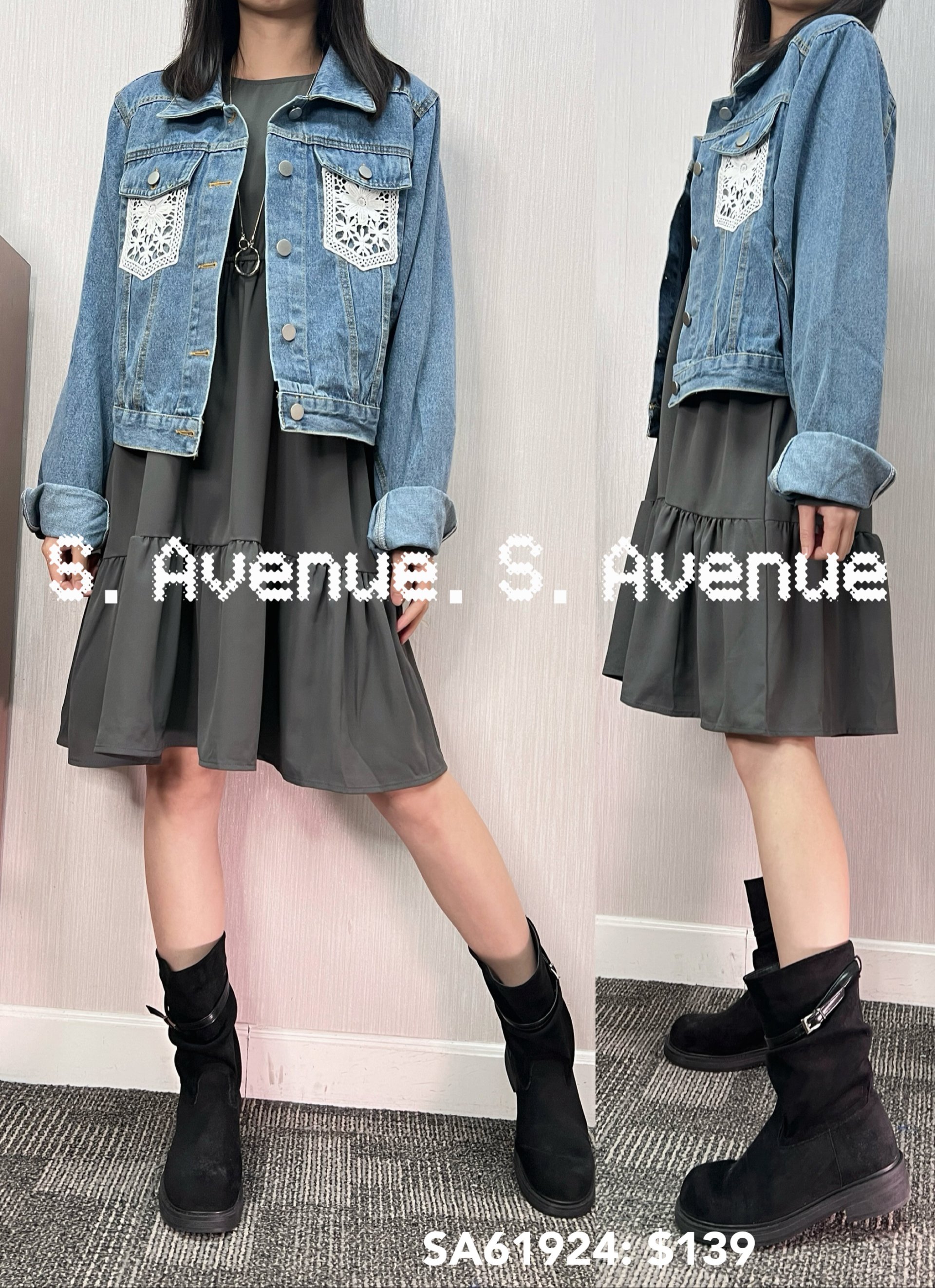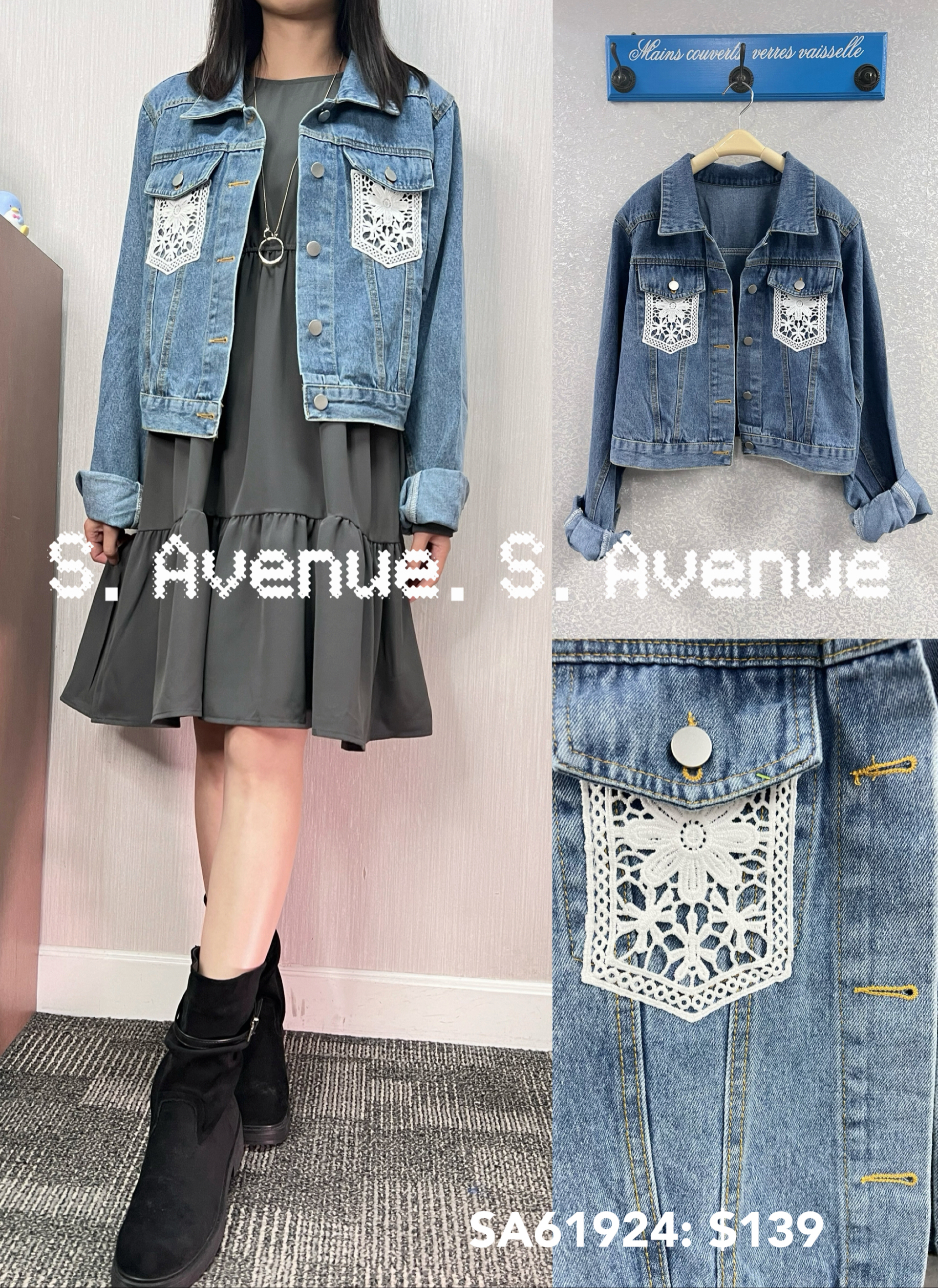 SA61924: 長袖前兩lace袋牛仔褸,質地是牛仔 顏色: 藍 Price: $ 139 One size: 適合m至L碼的身型,布料沒有彈性 尺寸:上圍40吋,腰40吋,長21吋 (尺寸只供參考,每人度均有不同,請預一至兩吋走盞)