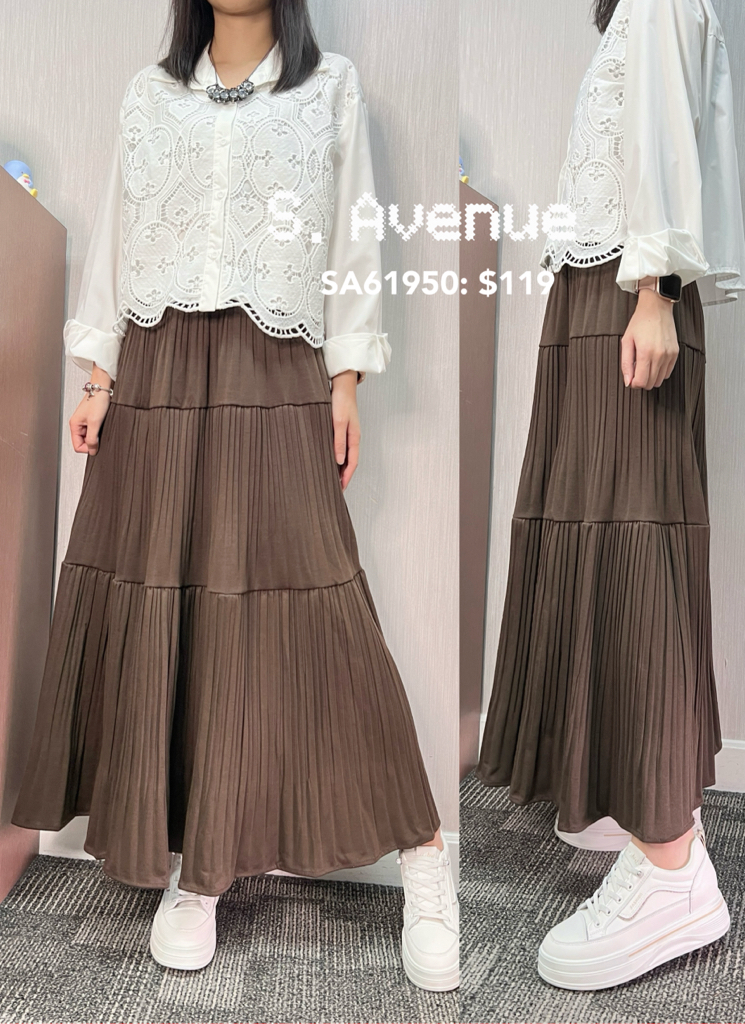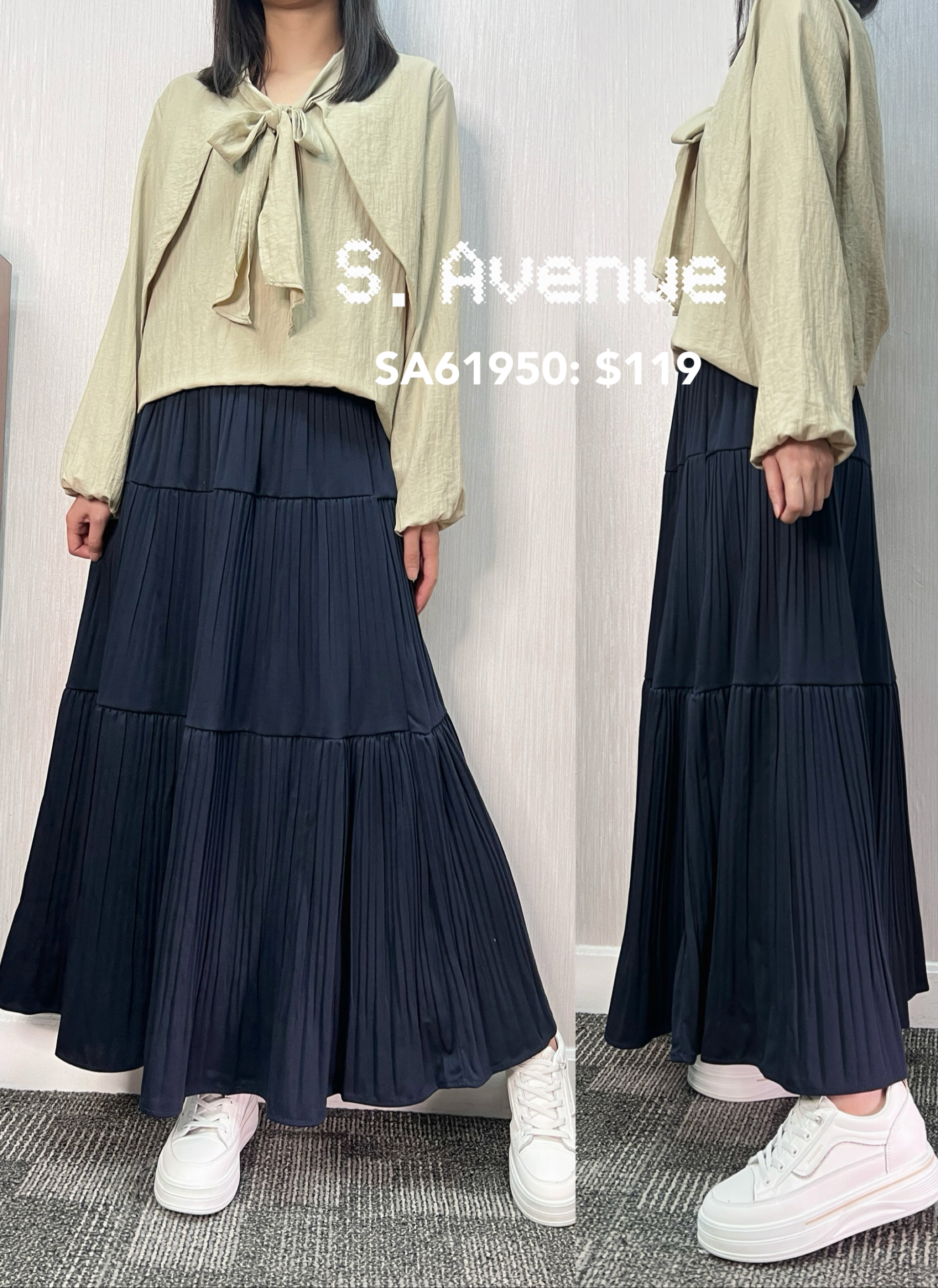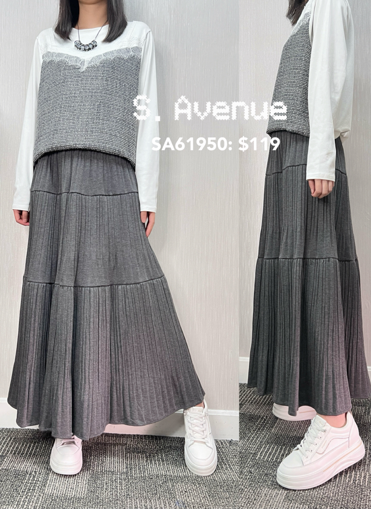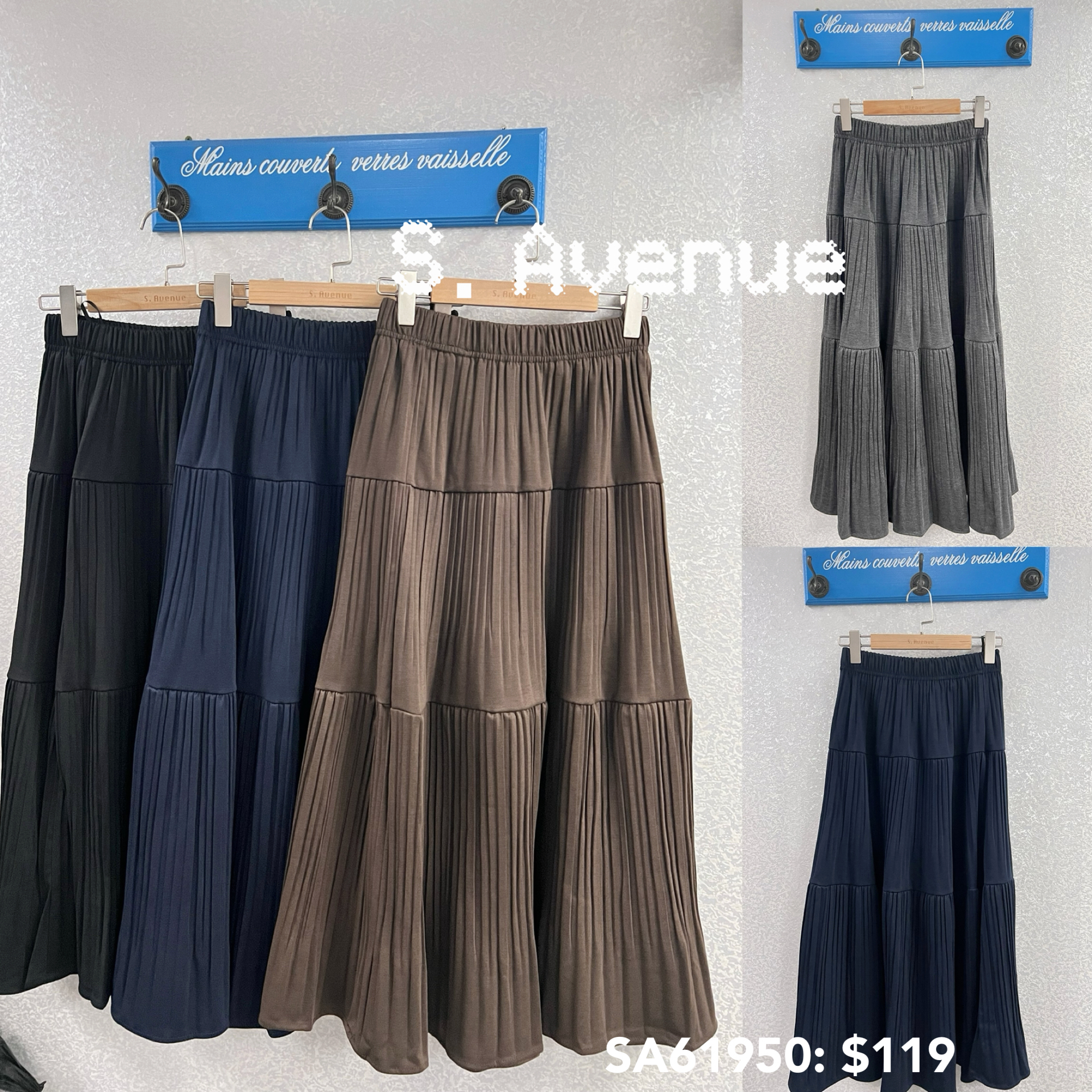 SA61950: 橡筋腰壓撍A字裙,質地是絨棉,百搭好襯 顏色:藍。黑,啡,灰 Price: $119 One size: 適合m碼至L碼的身型,布料有彈性 尺寸:腰26-40吋,hip48吋,長33吋 (尺寸只供參考,每人度均有不同,請預一至兩吋走盞)