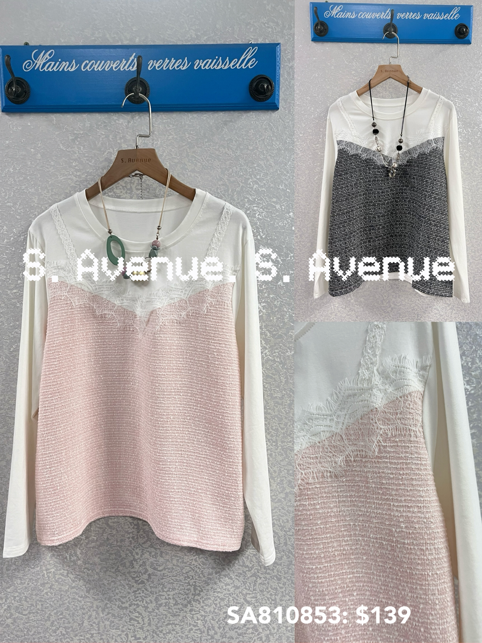 SA810853: 長袖假吊帶拼tweed料top,質地是棉拼tweed料,靚款推介❣️ 顏色: 粉,黑 Price: $139 One size: 適合m至L碼的身型,布料沒有彈性 尺寸:上圍40吋,腰40吋,長24吋 (尺寸只供參考,每人度均有不同,請預一至兩吋走盞)