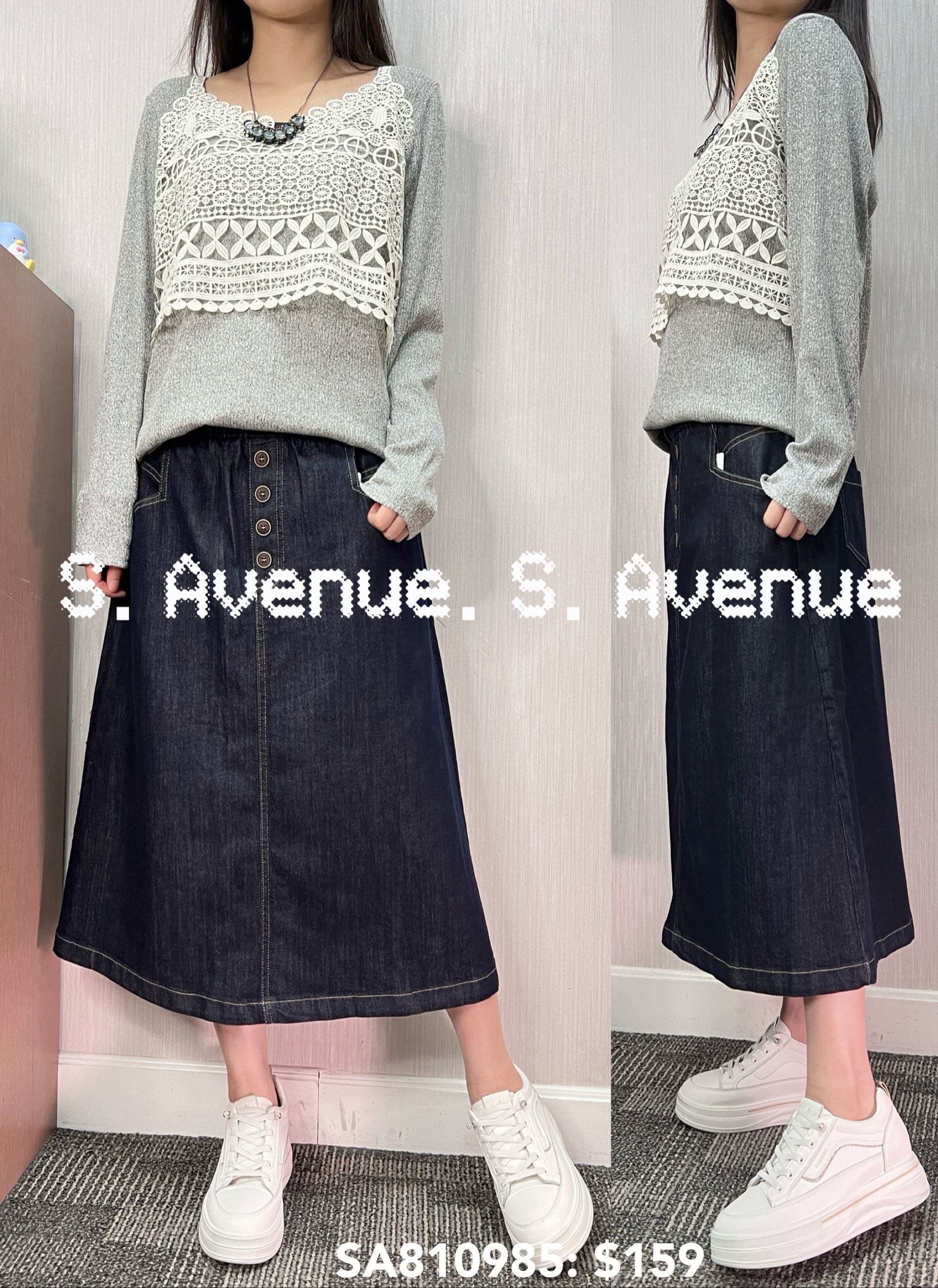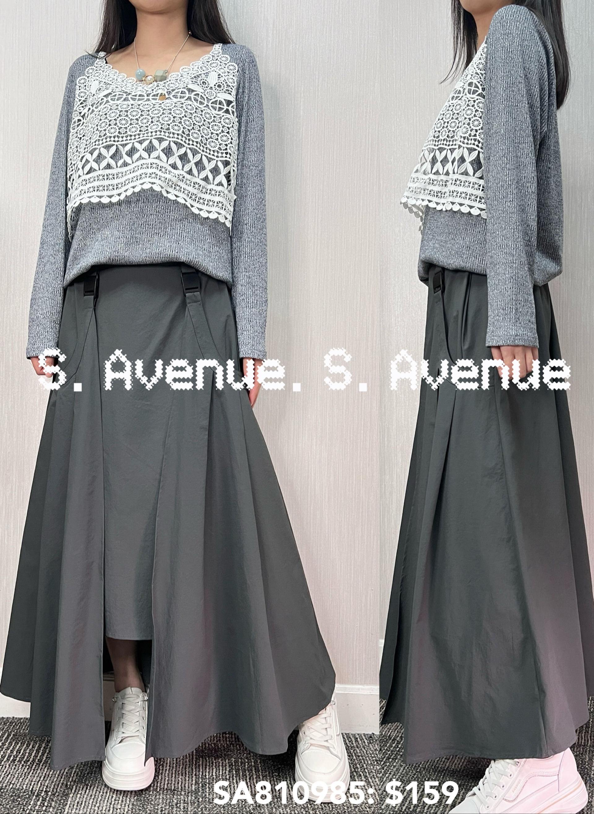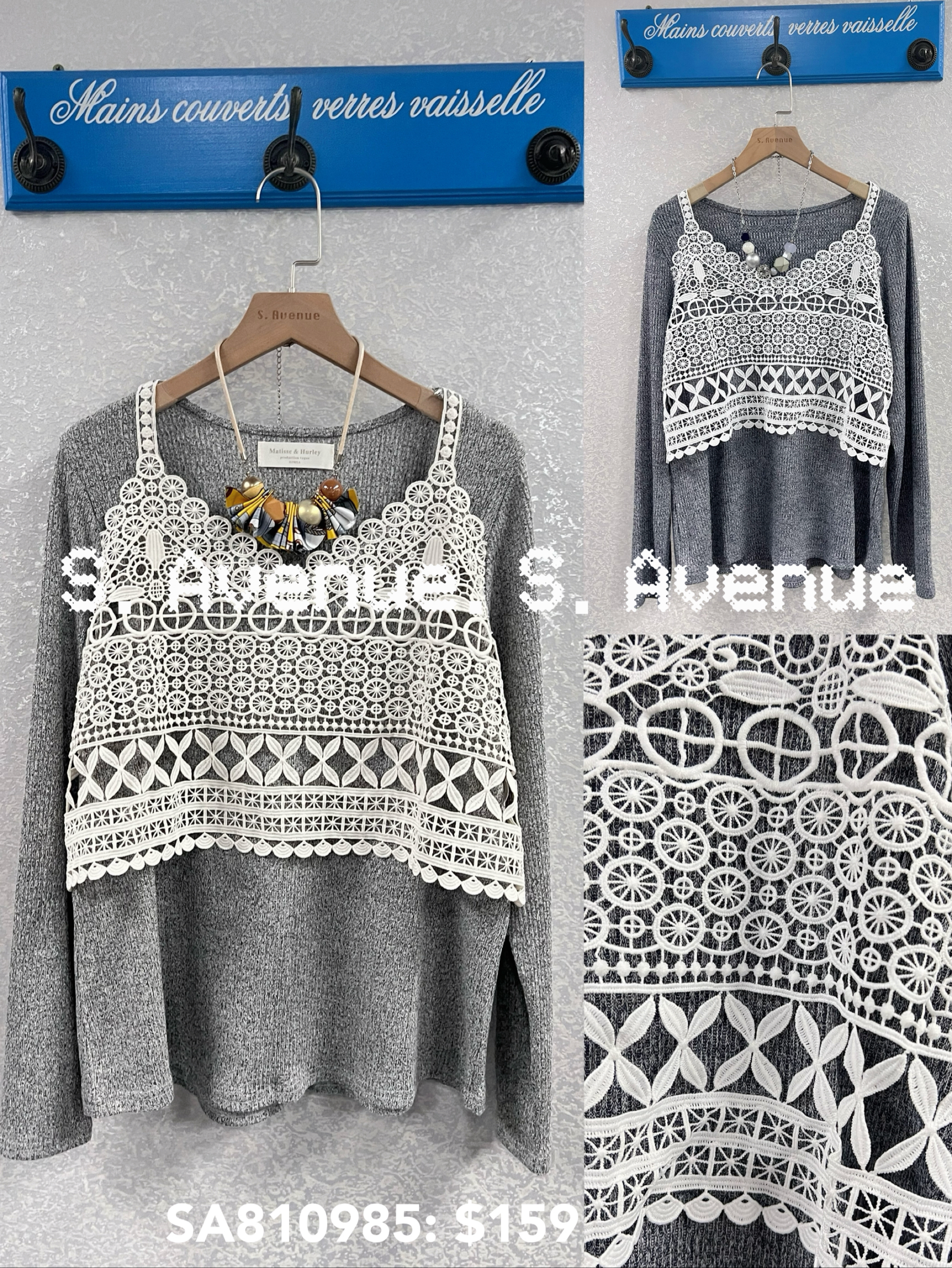 SA810985: 長袖假兩件勾織背心,質地是針織線料 顏色: 灰,深藍 Price: $159 One size: 適合m至L碼的身型,布料有彈性 尺寸:上圍42吋,腰42吋,長24吋 (尺寸只供參考,每人度均有不同,請預一至兩吋走盞)